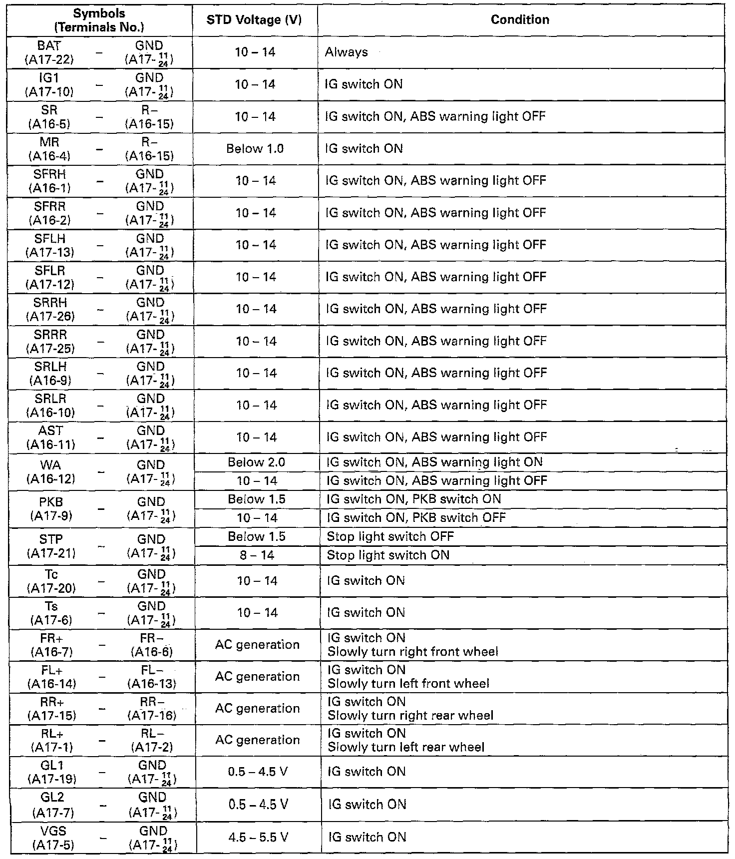Standard Values of ECU Terminals