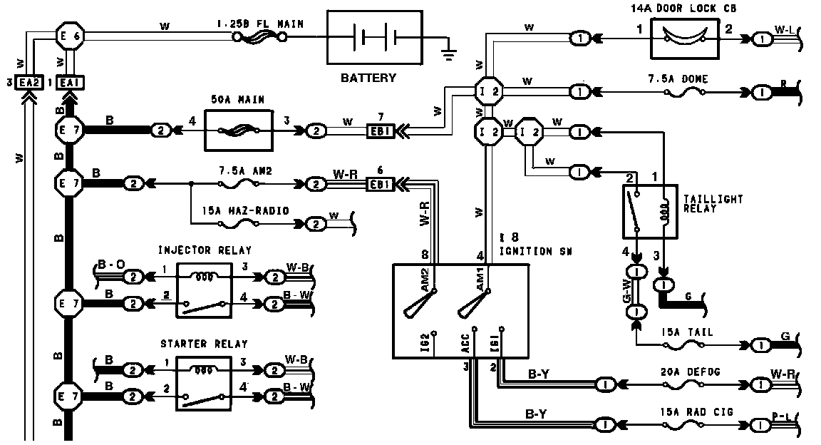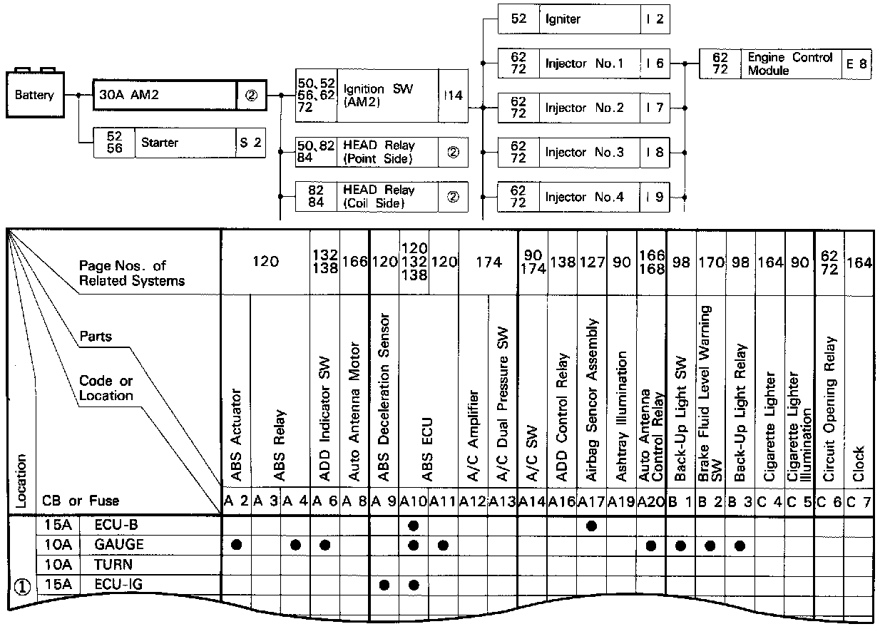 The chart shows the route by which current flows from the battery to each electric source (Fusible Link, Circuit Breaker, Fuse, etc.) and other parts.