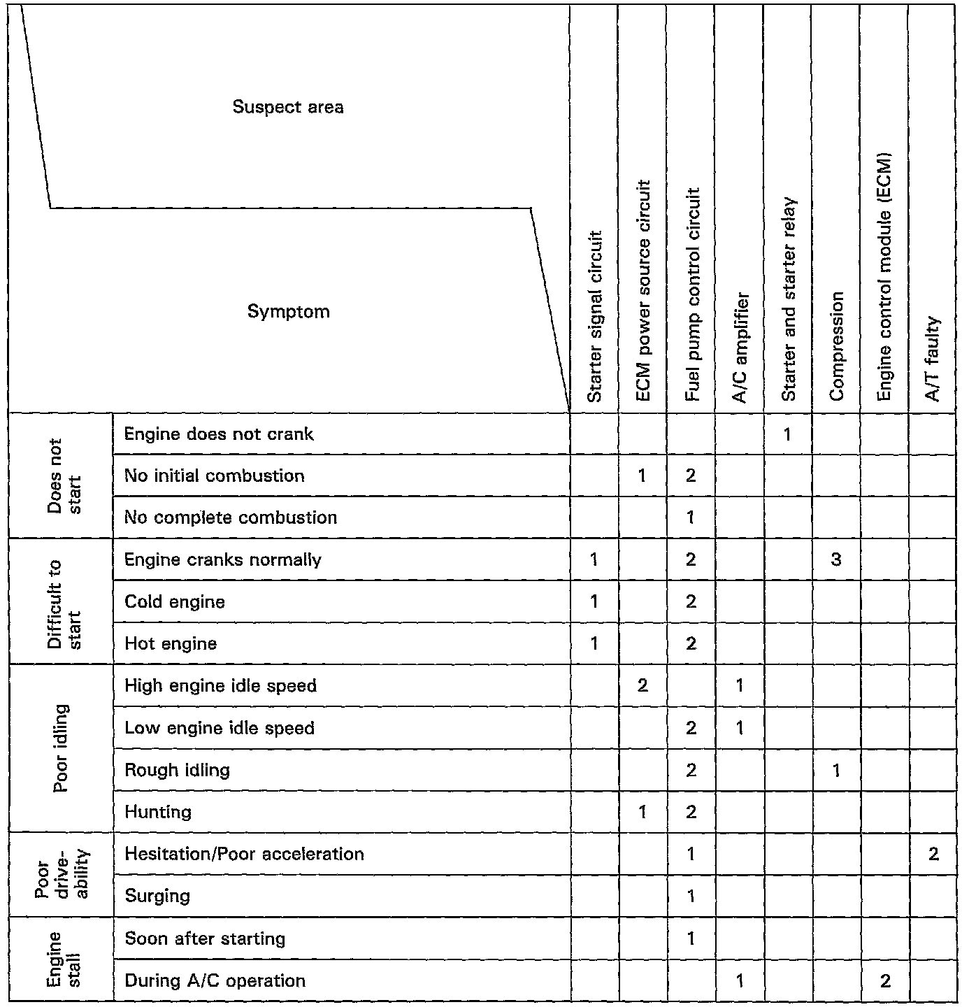 When the malfunction code is not confirmed in the diagnostic trouble code check and the problem still can not be confirmed in the basic inspection, then proceed to this step and perform troubleshooting according to the numbered order given in the table above.