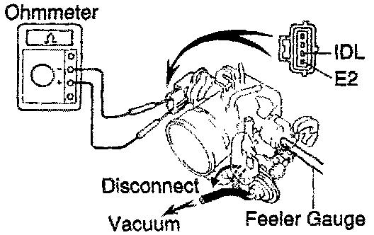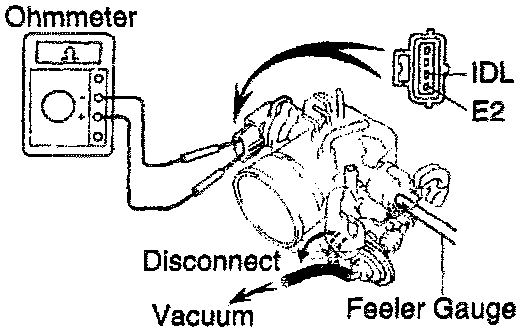 4. Connect the test probe of an ohmmeter to the terminals IDL and E2 of the TP sensor.