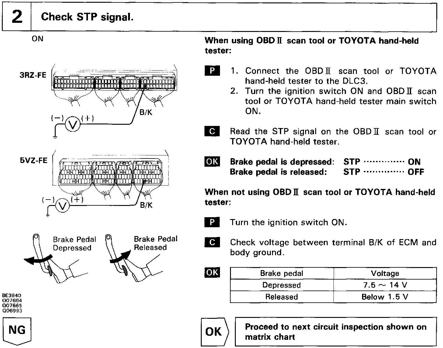 When the brake pedal is operated, this switch sends a signal to the ECM. Then the ECM cancels operation of the lock-up clutch while braking is in progress.
