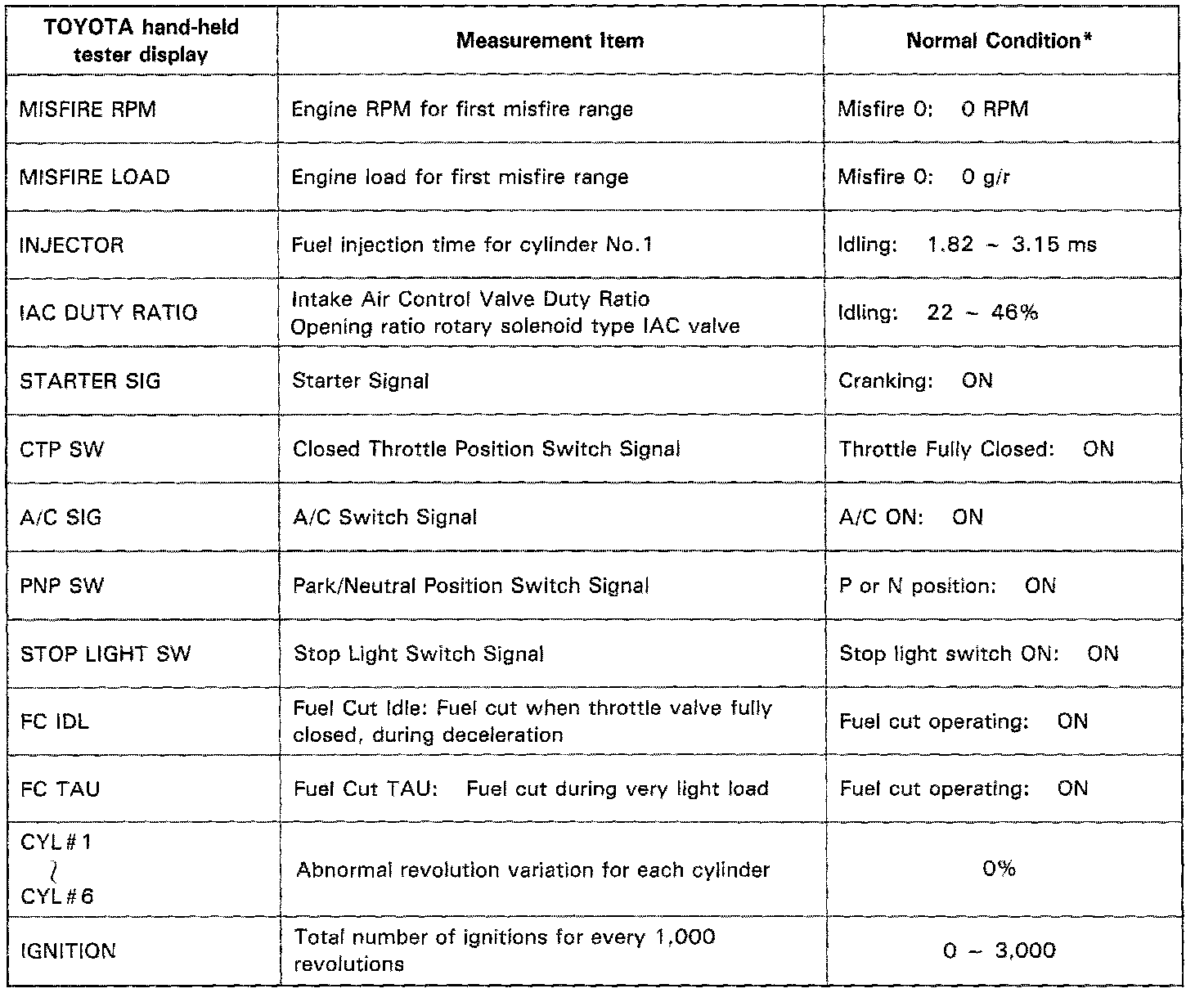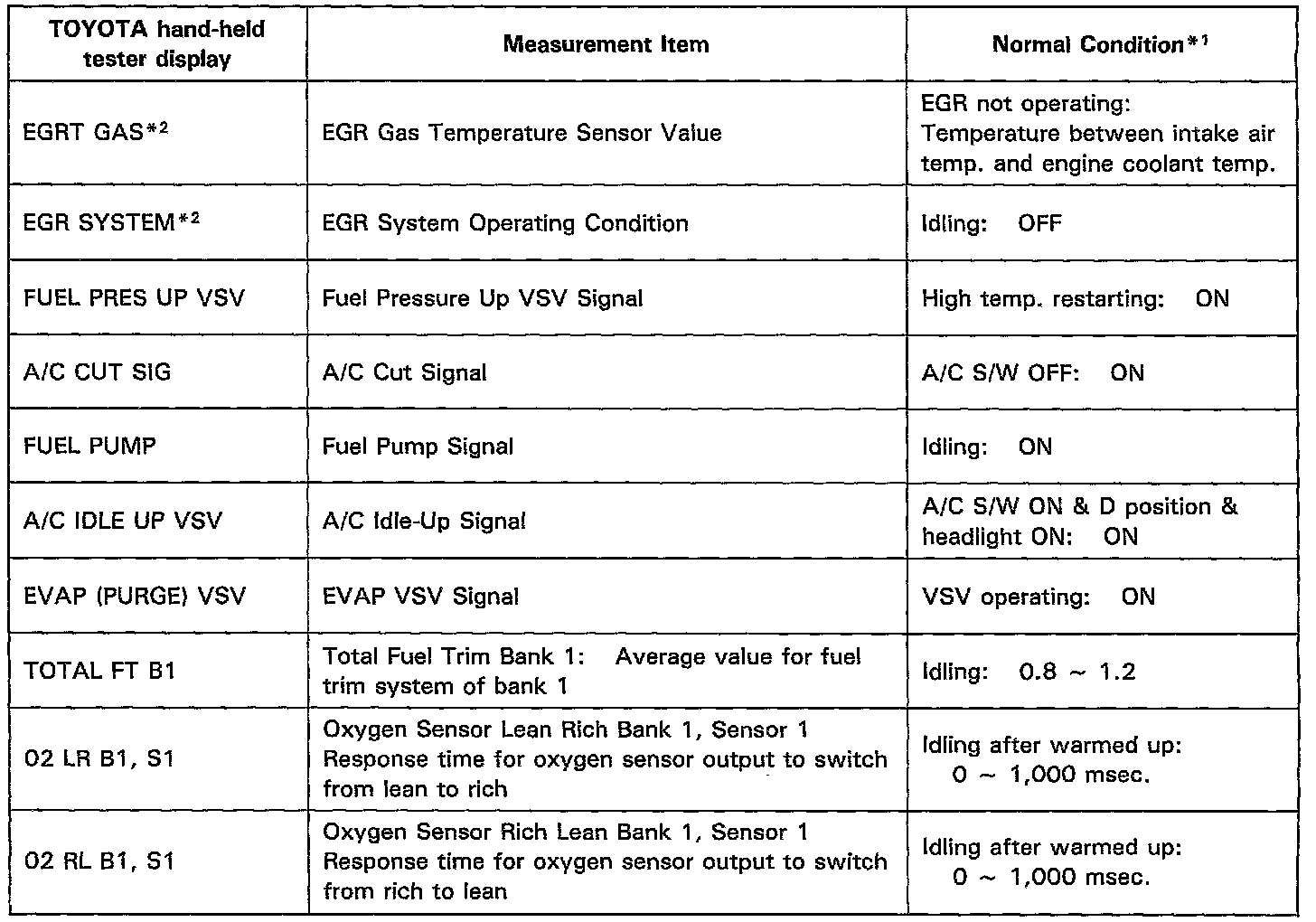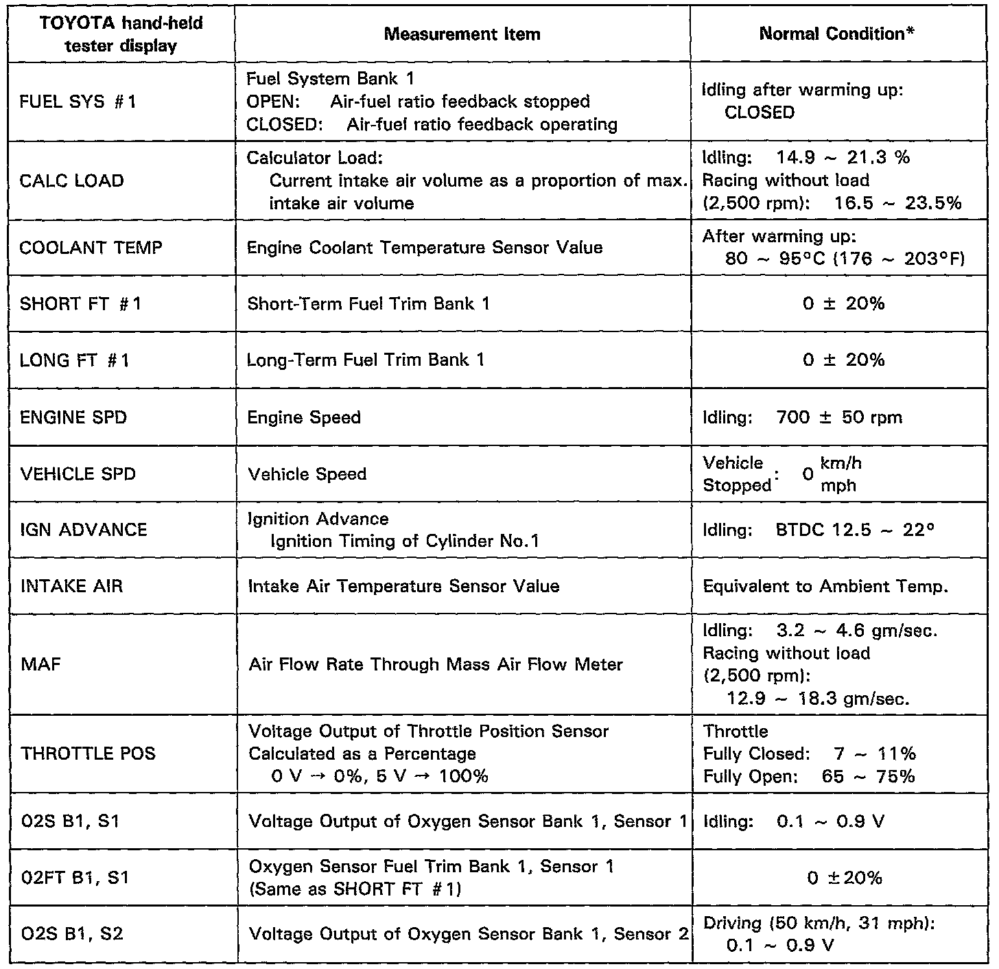 NOTICE: The values given below for "Normal Condition" are representative values, so a vehicle may still be normal even if its value varies from those listed here. So do not decide whether a part is faulty or not solely according to the "Normal Condition" here.CARB Mandated Signals
