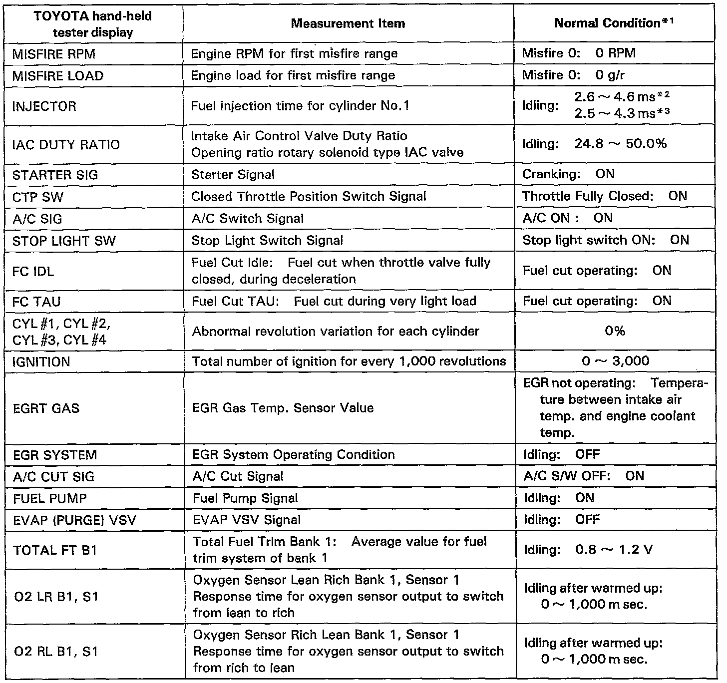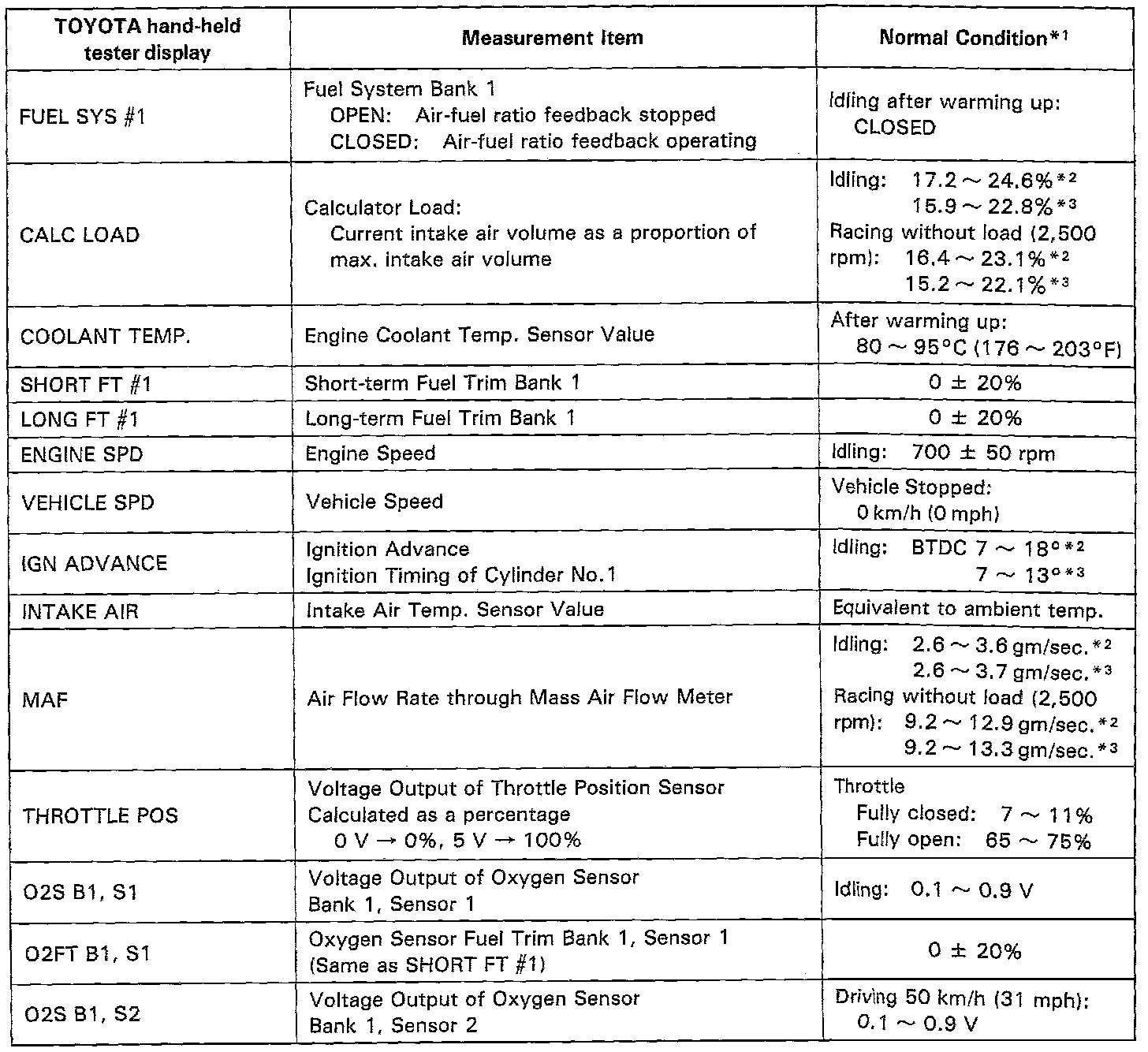 NOTICE: The values given below for "Normal Condition" are representative values, so a vehicle may still be normal even if its value varies from those listed here. So do not decide whether a part is faulty or not solely according to the "Normal Condition" here.CARB Mandated Signals