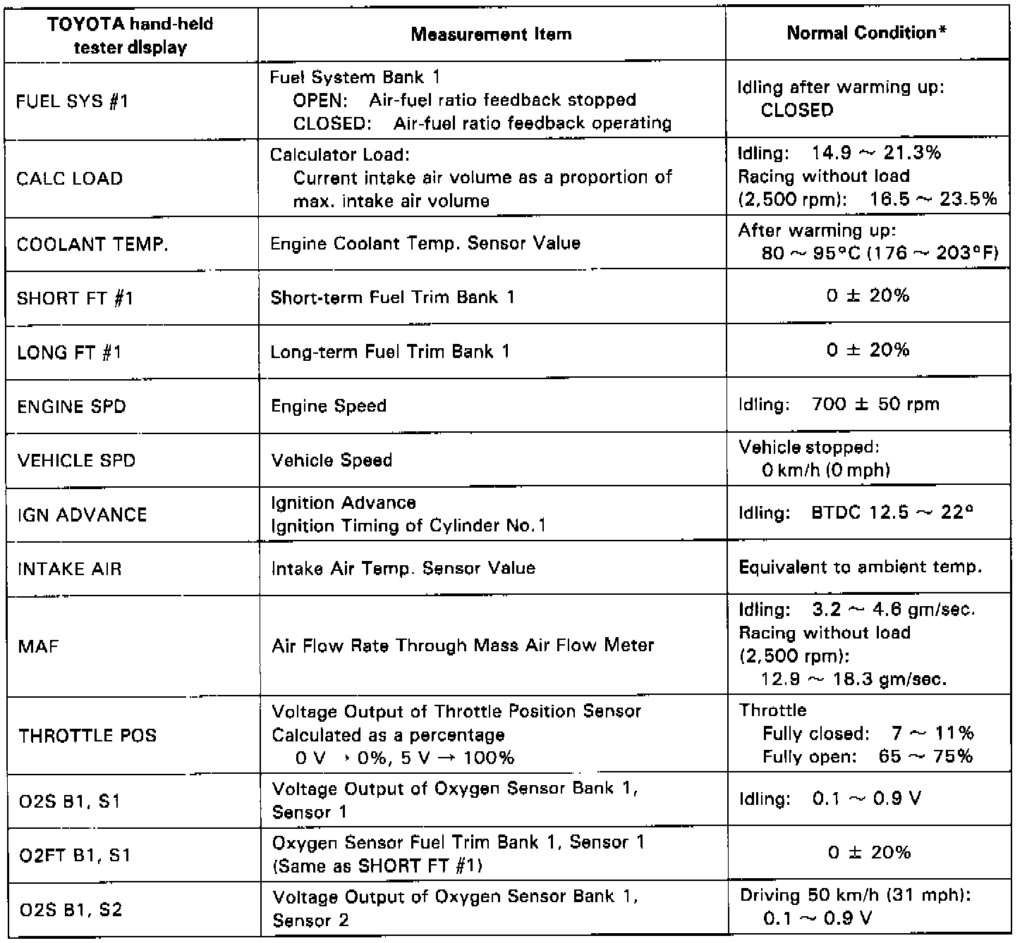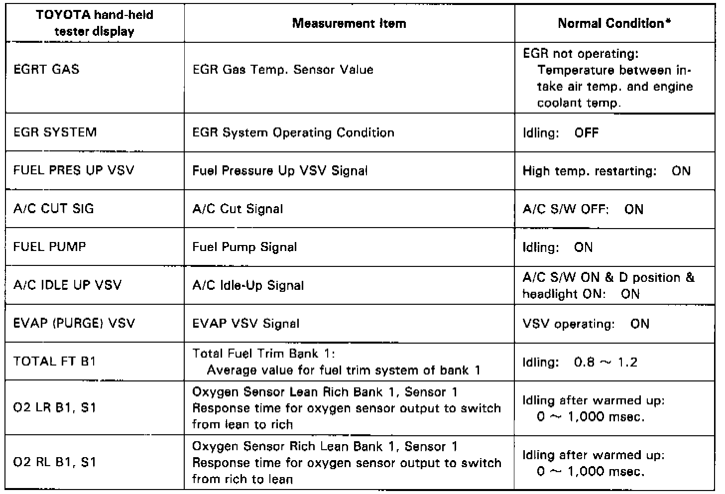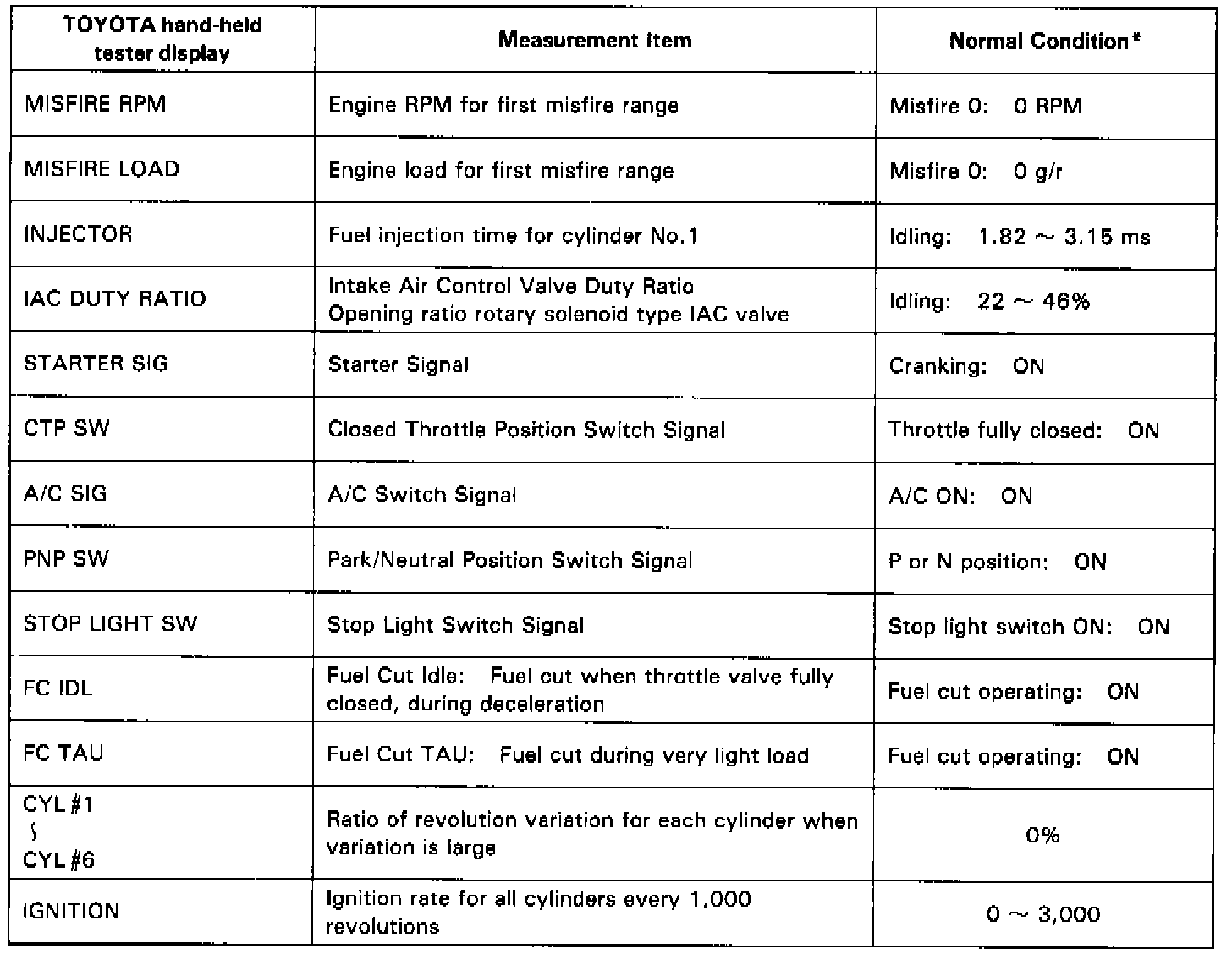 NOTICE: The values given below for "Normal Condition" are representative values, so a vehicle may still be normal even if its value varies from those listed here. So do not decide whether a part is faulty or not solely according to the "Normal Condition" here.CARB Mandated Signals