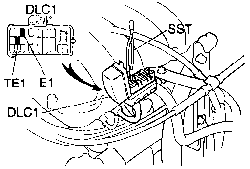 - Using SST 09843-18020 or equivalent, connect terminals TE1 and E1 of the DLC1.
