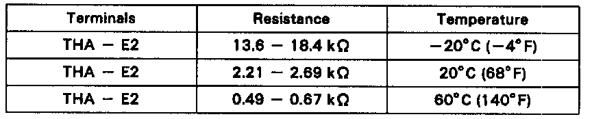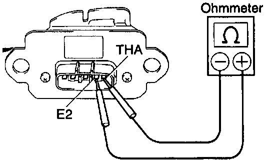 Using an ohmmeter, measure the resistance between terminals THA and E2. If the resistance is not as specified, replace the MAF meter.