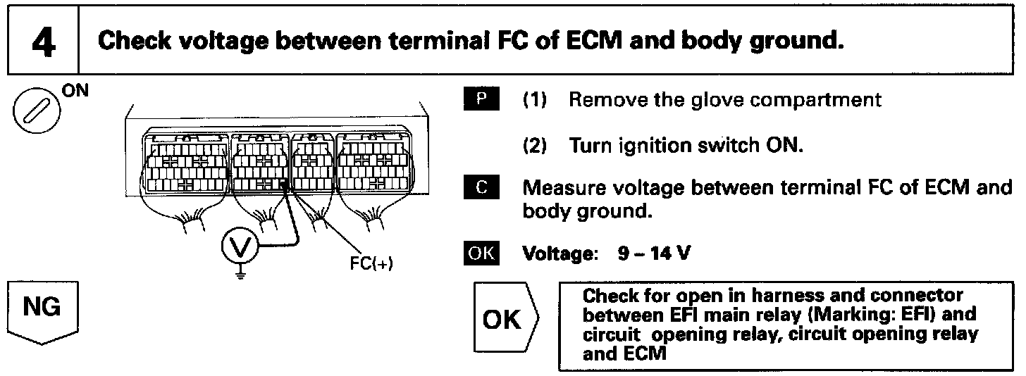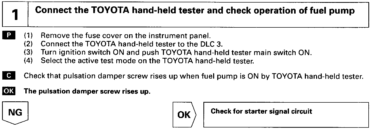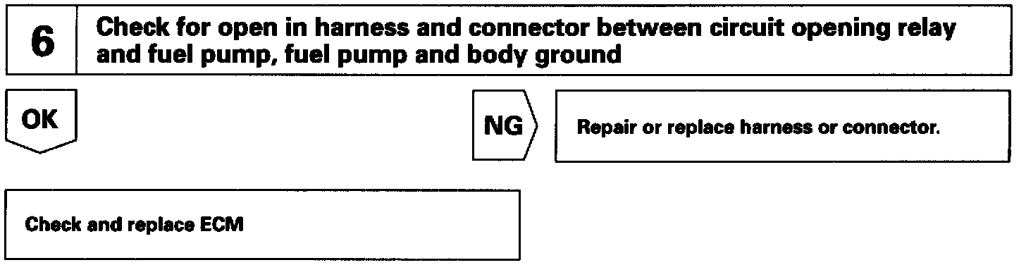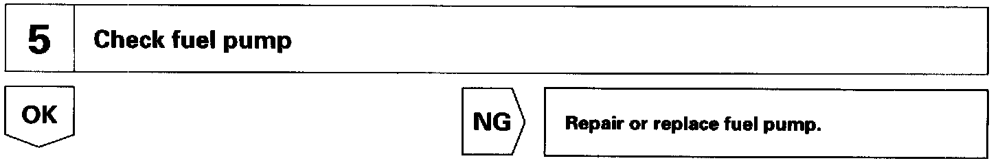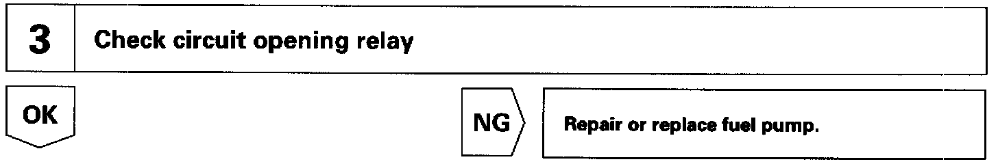 When the STA signal and NE signal are input to the ECM, Tr is turned ON, current flows to coil of the circuit opening relay, the relay switches on, power is supplied to the fuel pump and the fuel pump operates. While the NE signal is generated (engine running), the ECM keeps Tr ON (circuit opening relay ON) and the fuel pump also keeps operating.