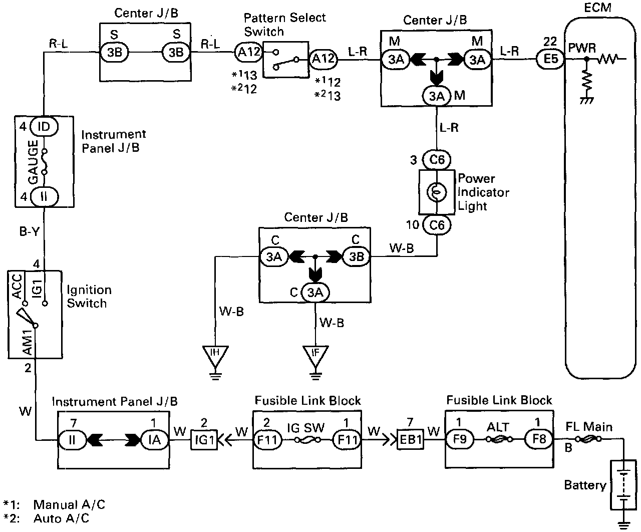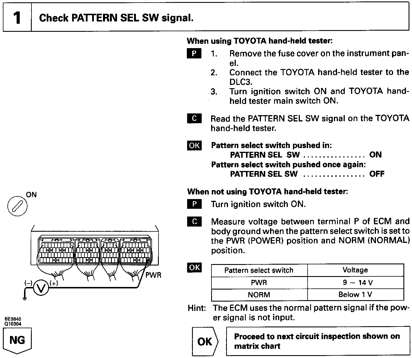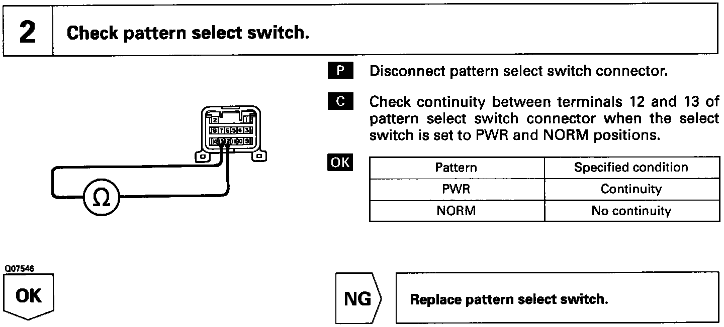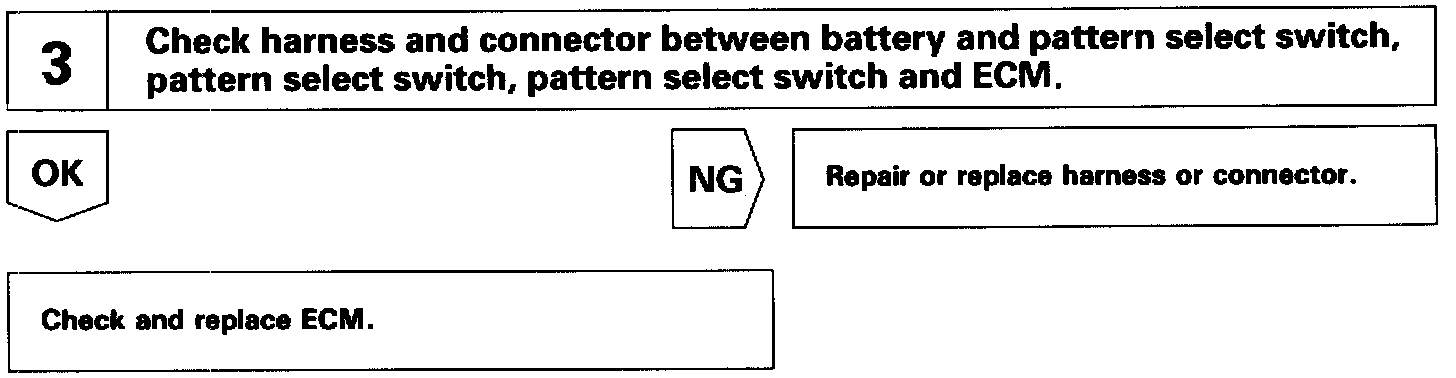 The ECM memory contains the shift programs for the NORMAL and POWER patterns, 2 position and L position and the lock-up patterns. Following the programs corresponding to the signals from the pattern select switch, the park/neutral position switch and other various sensors, the ECM switches the solenoid valves ON and OFF, thereby controlling the transaxle gear change and the lock-up clutch operation.