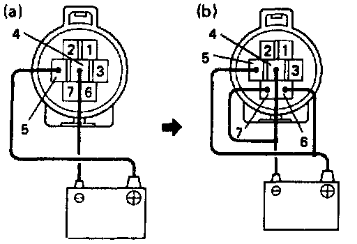 3. With the magnetic clutch ON, connect the positive (+) lead from the battery to terminal 7 and the negative (-) lead to terminal 6.