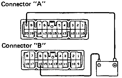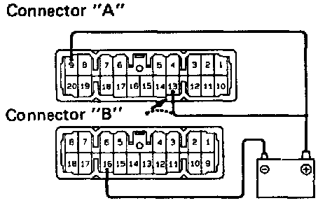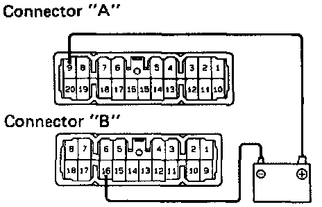 a. Connect the positive (+) lead from the battery to terminal A-9 and the negative (-) lead to terminal B-16.