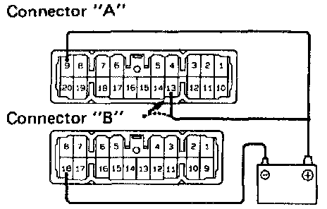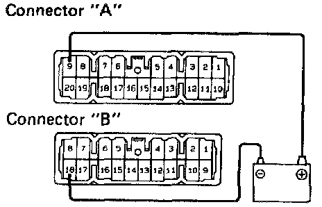 a. Connect the positive (+) lead from the battery to terminal A-9 and the negative (-) lead to terminal B-18.