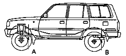 ^ B (Bumper stopper clearance): 104 mm (4.09 inch).If the clearance of the vehicle is not standard, try to level the vehicle by rocking it down. If still not correct, check for bad springs or suspension parts.