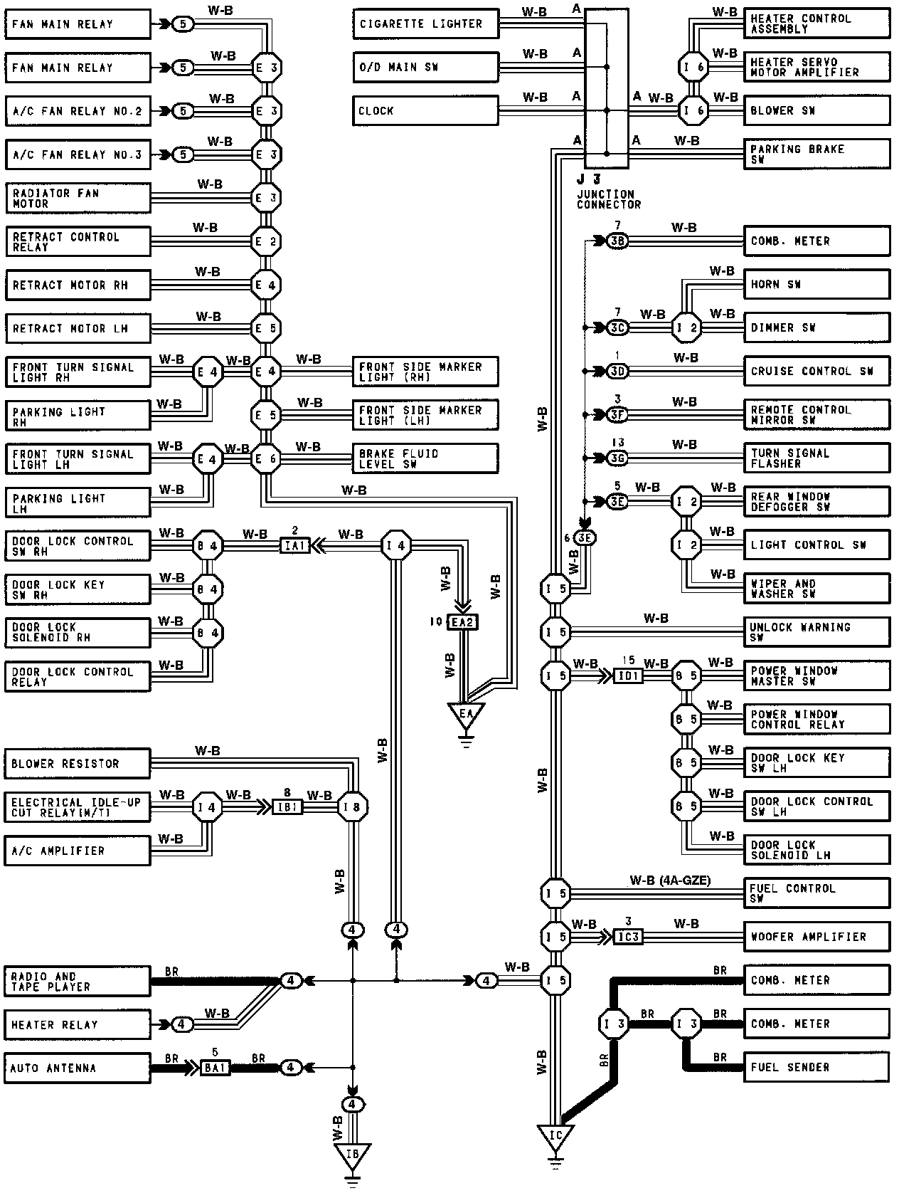 The ground points circuit diagram shows the connections from all major parts to the respective ground points. When troubleshooting a faulty ground point, checking the system circuits which use a common ground may help you identify the problem ground quickly. The relationship between ground points (EA, IB and IC shown below) can also be checked this way.