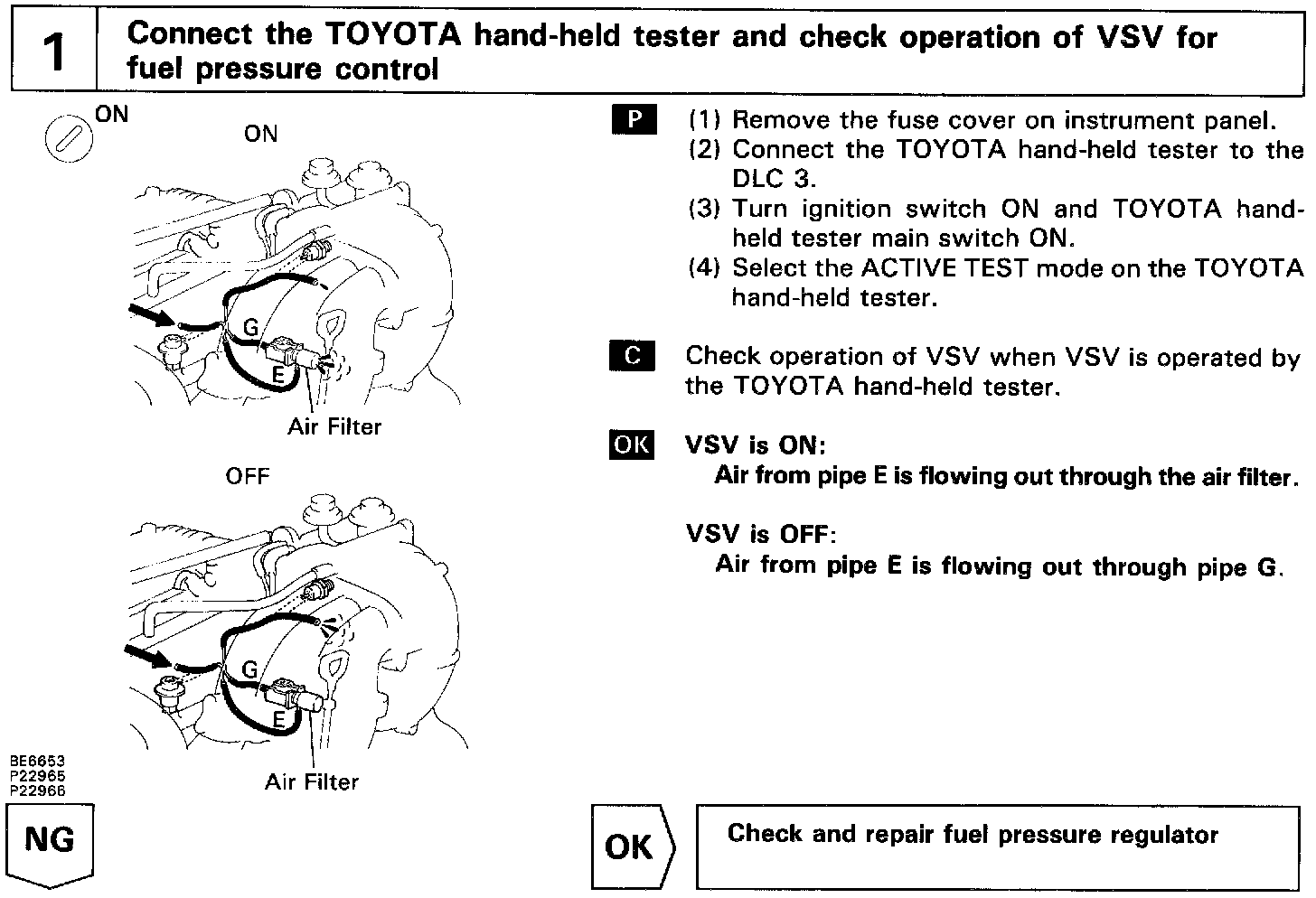 The ECM turns on a VSV (Vacuum Switching Valve) to draw the air into the diaphragm chamber of the pressure regulator if it detects that the temperature of the engine coolant is too high during engine starting.