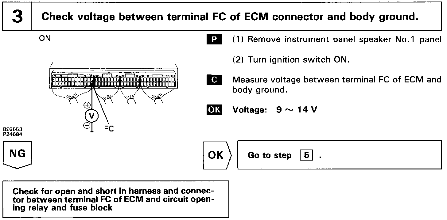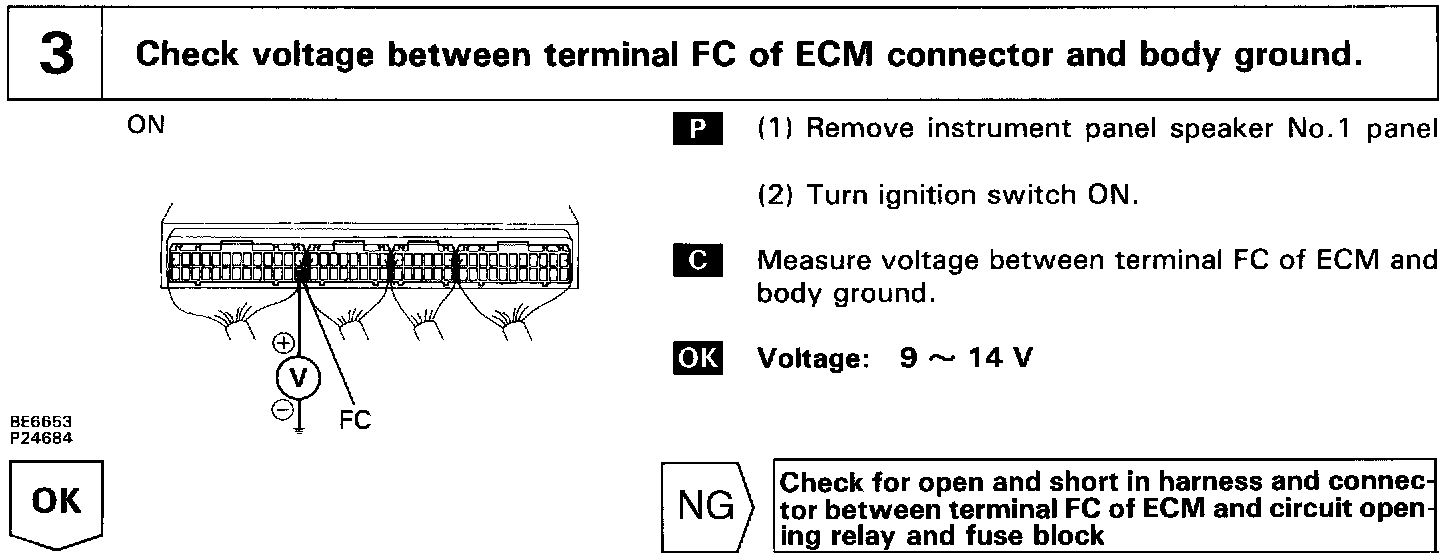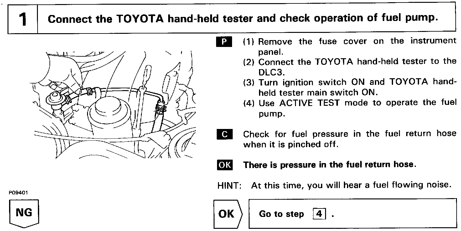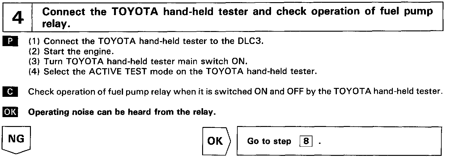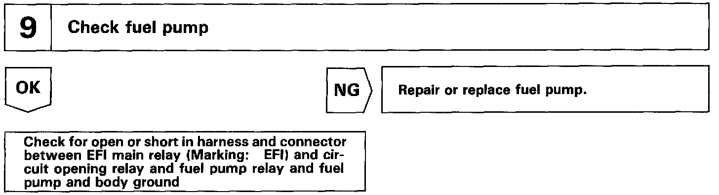 When the STA signal and NE signal are input to the ECM, Tr1 is turned ON, current flows to coil of the circuit opening relay, the relay switches on, power is supplied to the fuel pump and the fuel pump operates. While the NE signal is generated (engine running), the ECM keeps Tr1 ON (circuit opening relay ON) and the fuel pump also keeps operating.