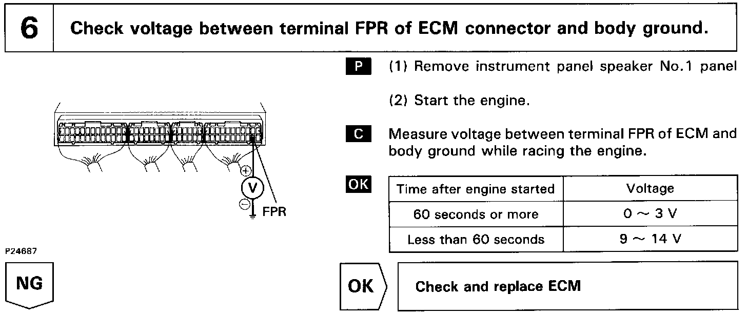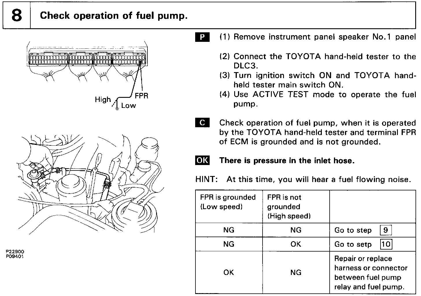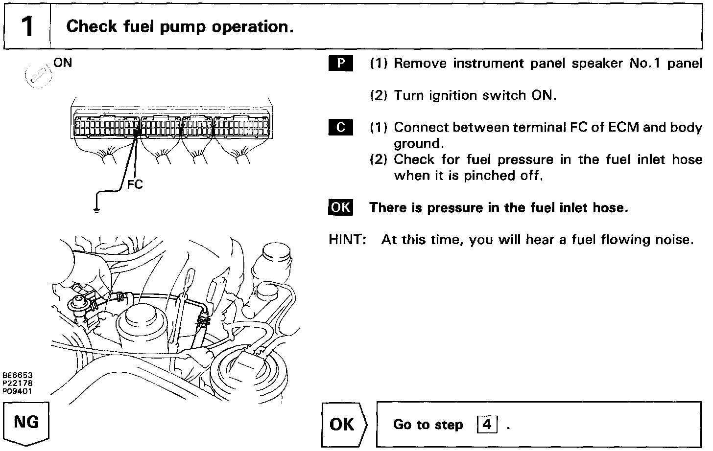 When the STA signal and NE signal are input to the ECM, Tr1 is turned ON, current flows to coil of the circuit opening relay, the relay switches on, power is supplied to the fuel pump and the fuel pump operates. While the NE signal is generated (engine running), the ECM keeps Tr1 ON (circuit opening relay ON) and the fuel pump also keeps operating.