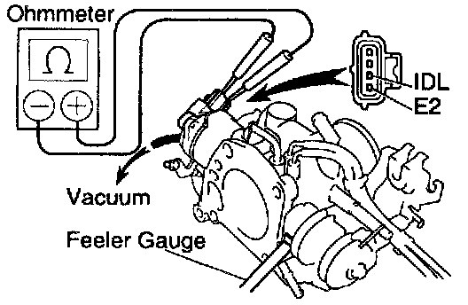 (d) Connect the test probe of an ohmmeter to the terminals IDL and E2 of the sensor.