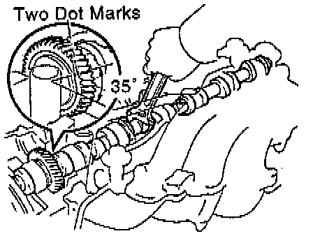 (a) Set the timing mark (two dot marks) of the camshaft drive gear at approximately 35° angle by turning the hexagon wrench head portion of the intake camshaft with a wrench.