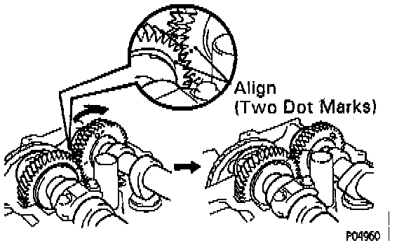 (c) Engage the exhaust camshaft gear to the intake camshaft gear by matching the timing marks (two dot marks) on each gear.