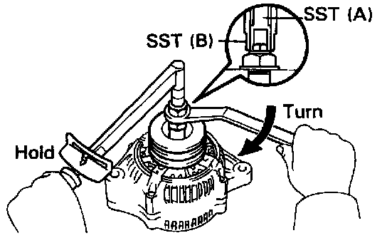 f. To torque the pulley nut turn SST (A) in the direction shown in the illustration.