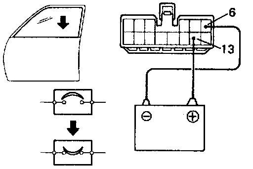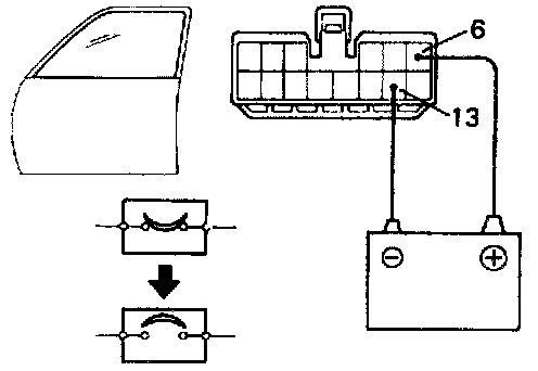 b. Connect the positive (+) lead from the battery to terminal 6 and the negative (-) lead to terminal 13 on the wire harness side connector and raise the window to full closed position.