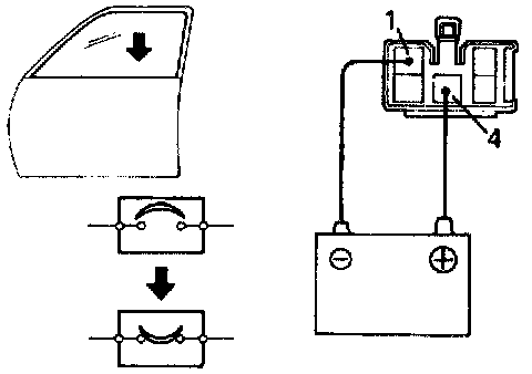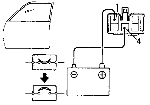 b. Connect the positive (+) lead from the battery to terminal 1 and the negative (-) lead to terminal 4 on the wire harness side connector. and raise the window to full closed position.