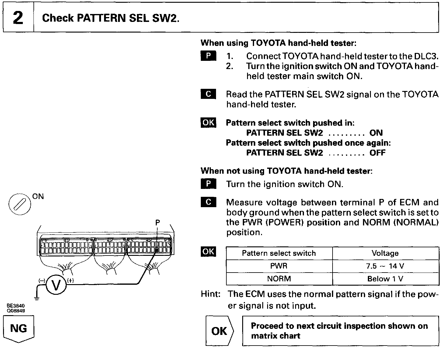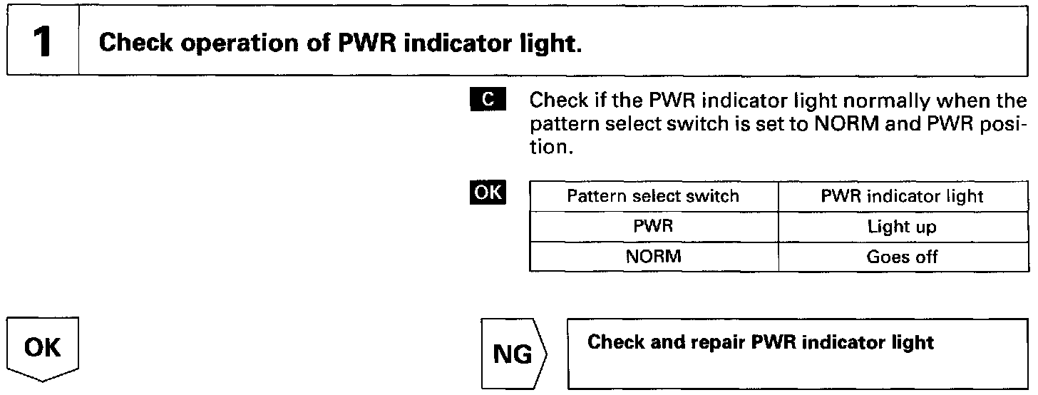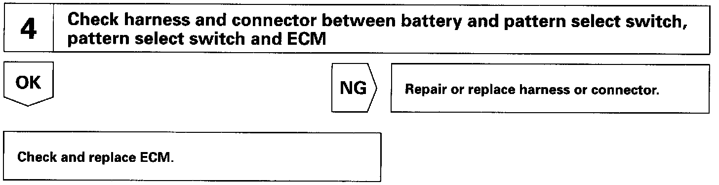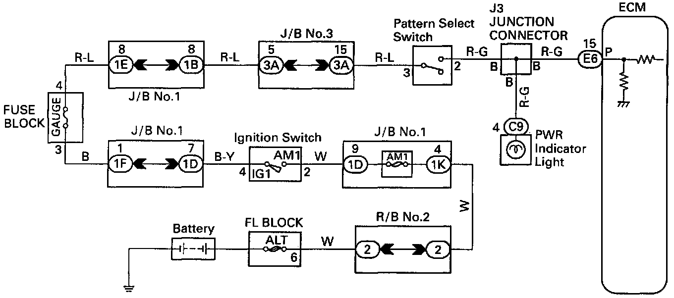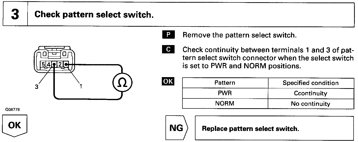 The ECM memory contains the shift programs for the NORMAL and POWER patterns, 2 position, and L position and the lock-up patterns. Following the programs corresponding to the signals from select switch, the park/neutral position switch and other various sensors, the ECM switches the solenoid valves ON and OFF, and control the transmission gear change and the lock-up clutch operation.