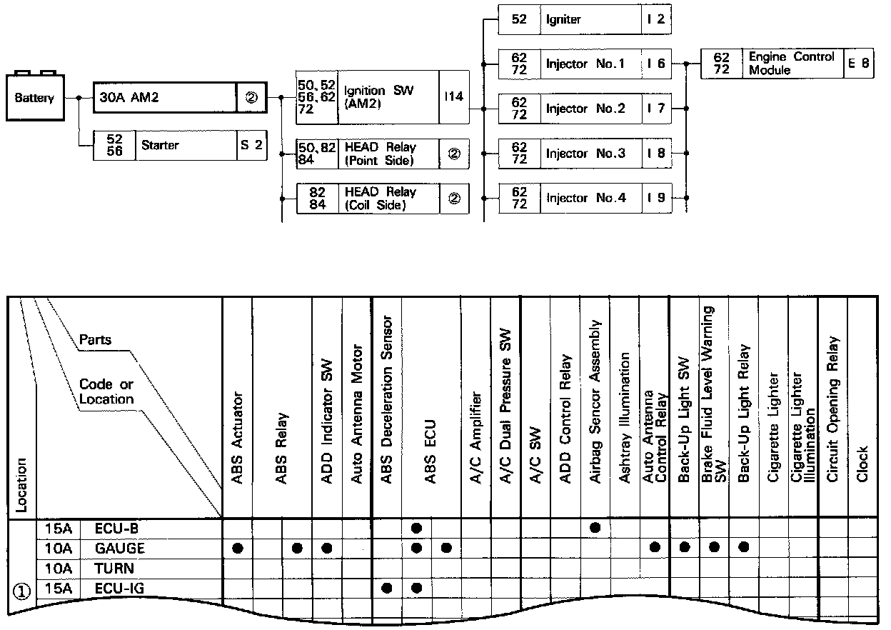 The chart shows the route by which current flows from the battery to each electrical source (Fusible Link, circuit Breaker, Fuse, etc.) and other parts.