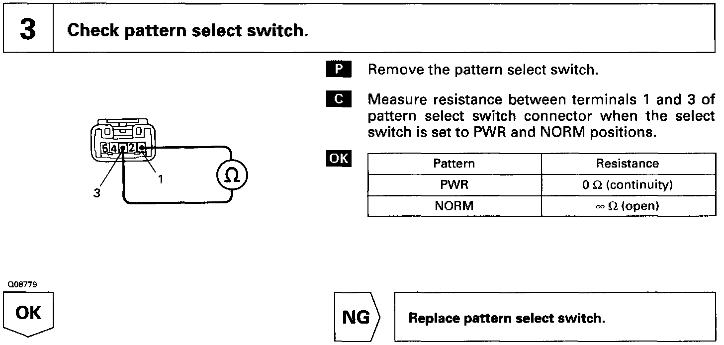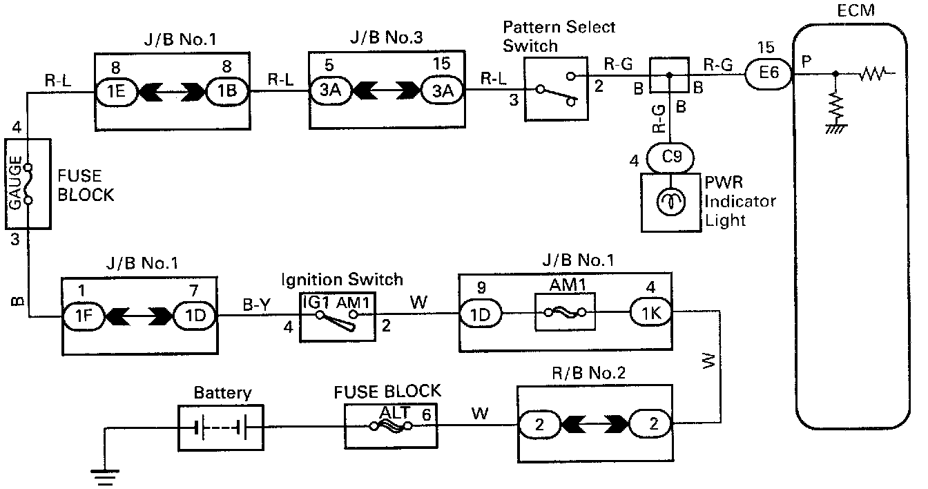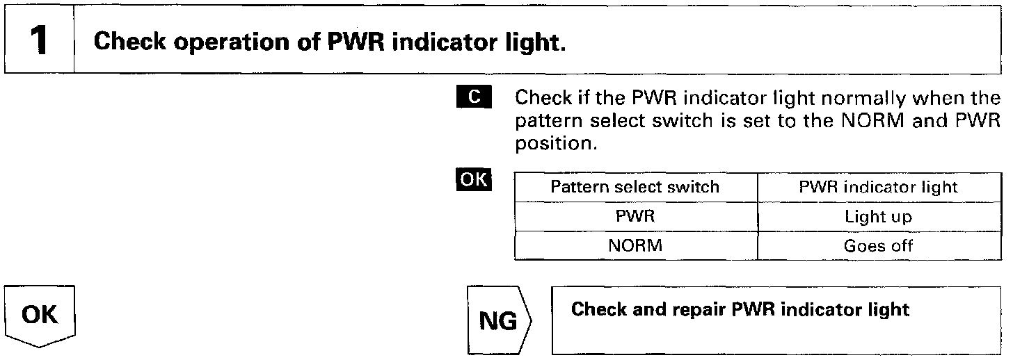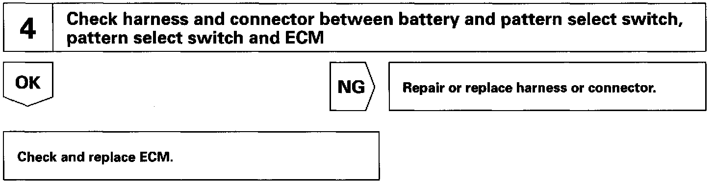 The ECM memory contains the shift programs for the NORMAL and POWER patterns, 2 and L position and the lock-up patterns. Following the programs corresponding to the signals from the pattern select switch, the park/neutral position switch and other various sensors, the ECM switches the solenoid valves ON and OFF, and control the transmission gear change and the lock-up clutch operation