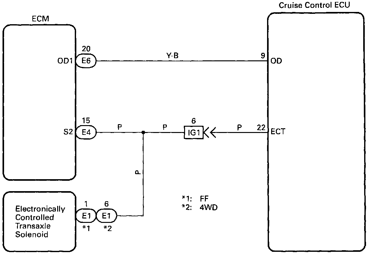 Terminal ECM of the cruise control ECU detects the shift change signal (output to electronically controlled transmission No.2 solenoid) from the electronically controlled transmission.