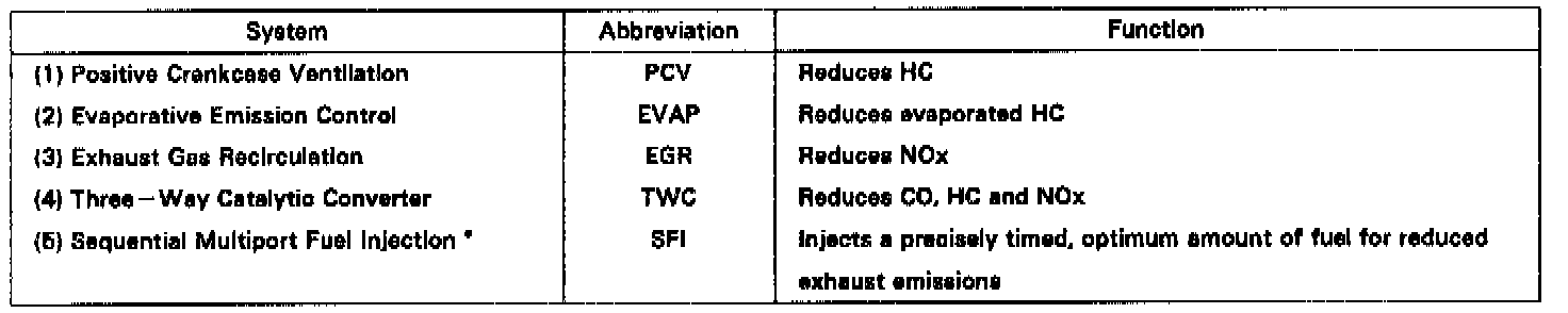 The emission control systems are installed to reduce the amount of CO, HC and NOx exhausted from the engine ((3), (4) and (5)), to prevent the atmospheric release of blow-by gas-containing HC (1) and evaporated fuel containing HC being released from the fuel tank (2).