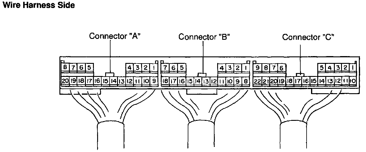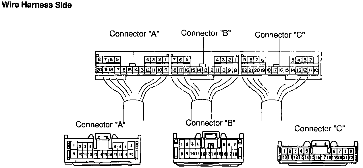 c. Connect the connectors to the amplifier and inspect the wire harness side connector from the back side, as shown in the chart.