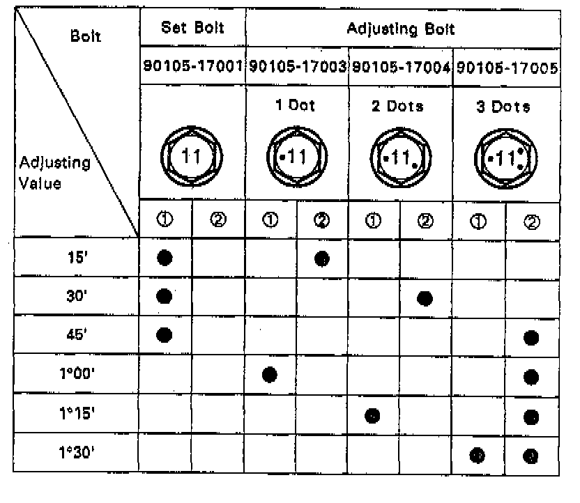 - Adjusting value for the set bolts is 6' - 30' (0.1° - 0.5°).
