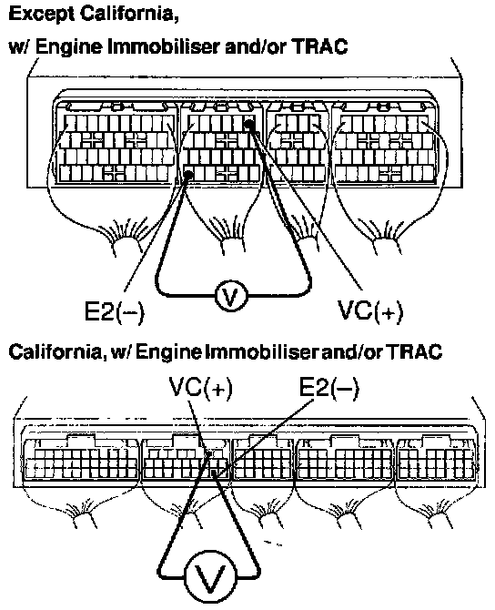 (c) Connect a voltmeter to terminals VC and E2 of the ECU, and measure the power source voltage.