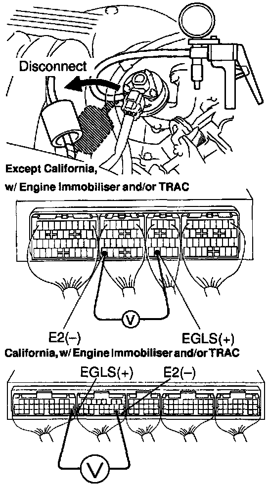 (d) Connect a voltmeter to terminals EGLS and E2 of the ECU, and measure the power outlet voltage under the following conditions;