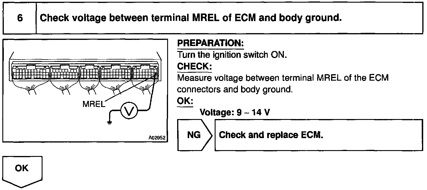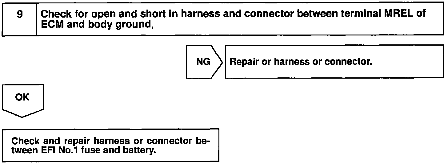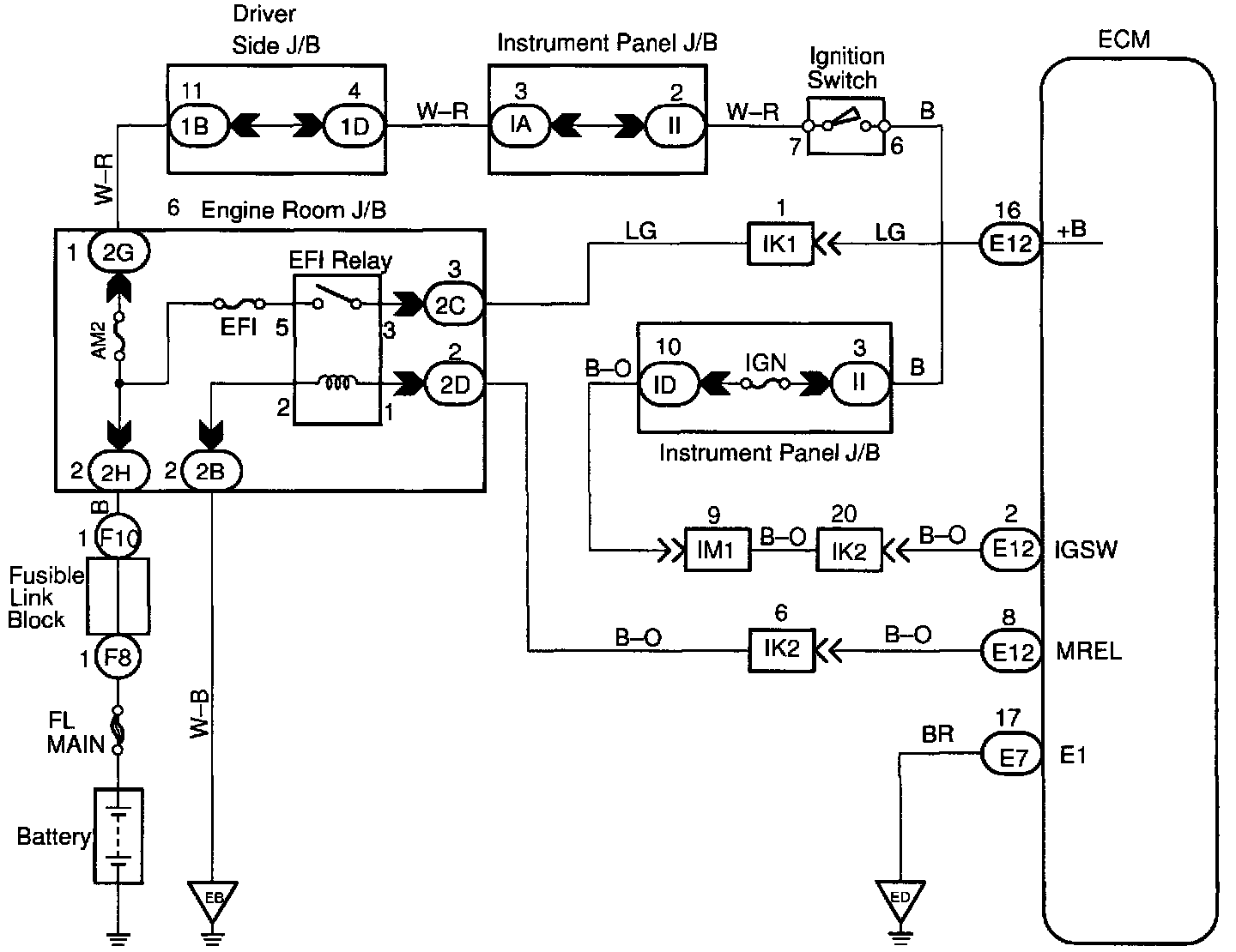 When the ignition switch is turned on, battery positive voltage is applied to the terminal IGSW of the ECM and the EFI main relay (Marking: EFI) control circuit in the ECM sends a signal to the terminal MREL of the ECM switching on the EFI main relay.
