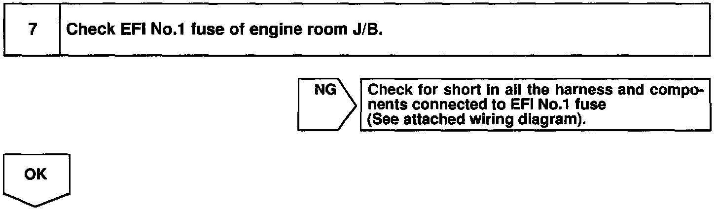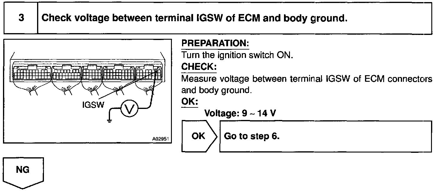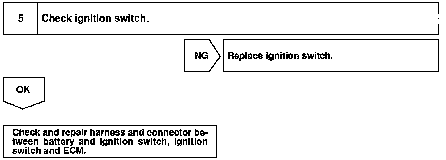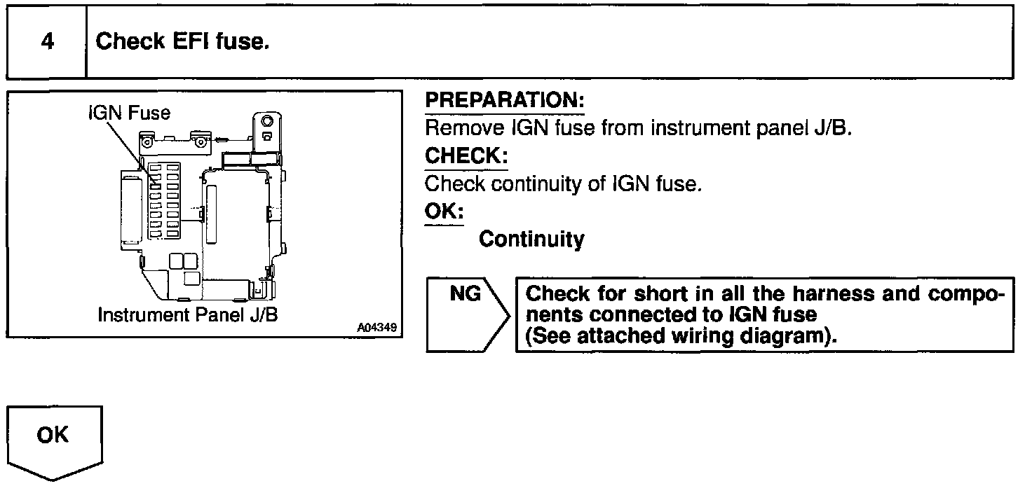 When the ignition switch is turned on, battery positive voltage is applied to the terminal IGSW of the ECM and the EFI main relay (Marking: EFI) control circuit in the ECM sends a signal to the terminal MREL of the ECM switching on the EFI main relay.