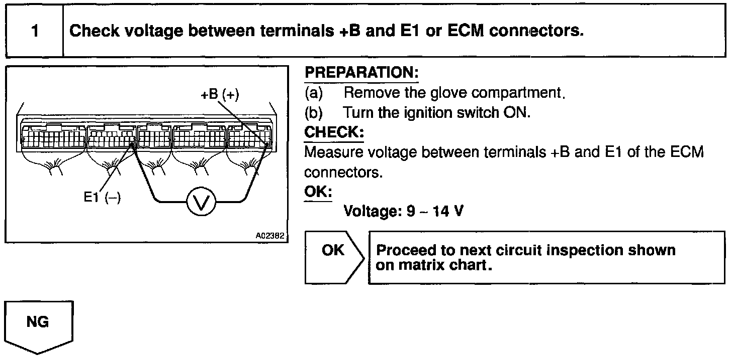 This signal causes current to flow to the coil, closing the contacts of the EFI, main relay and supplying power to the terminals +B of the ECM.