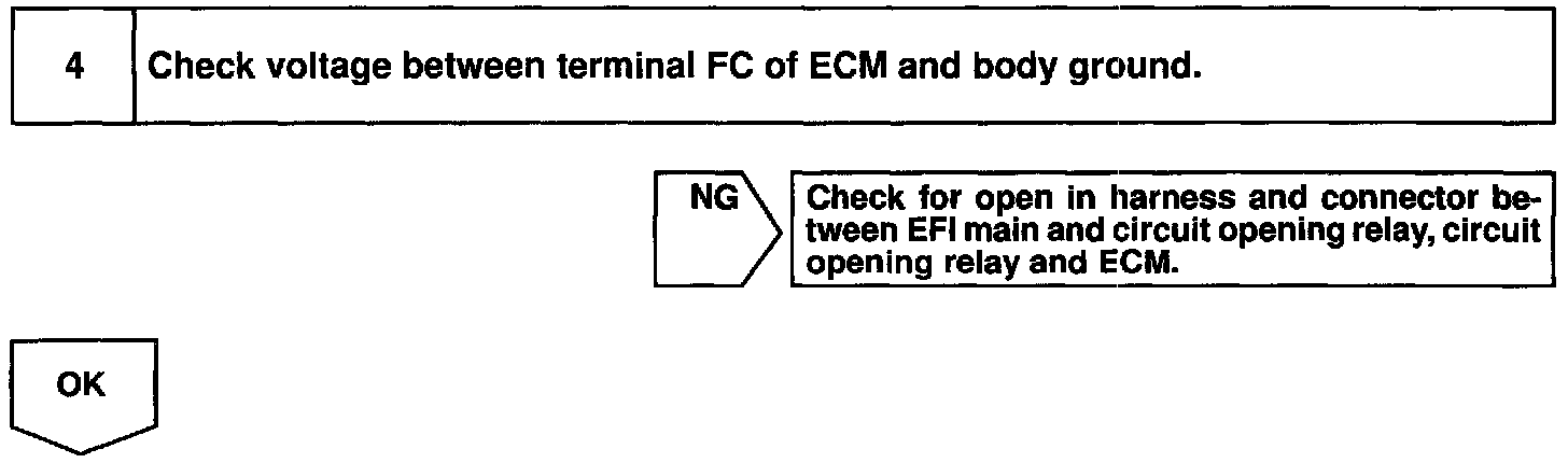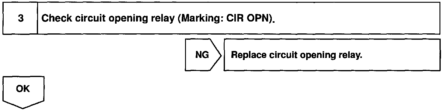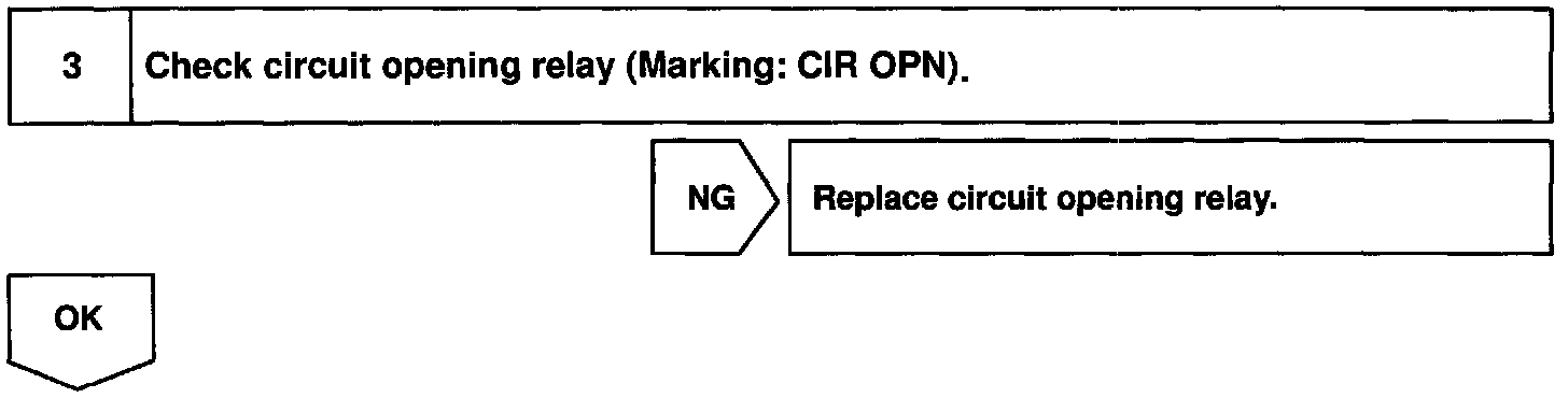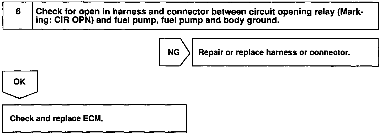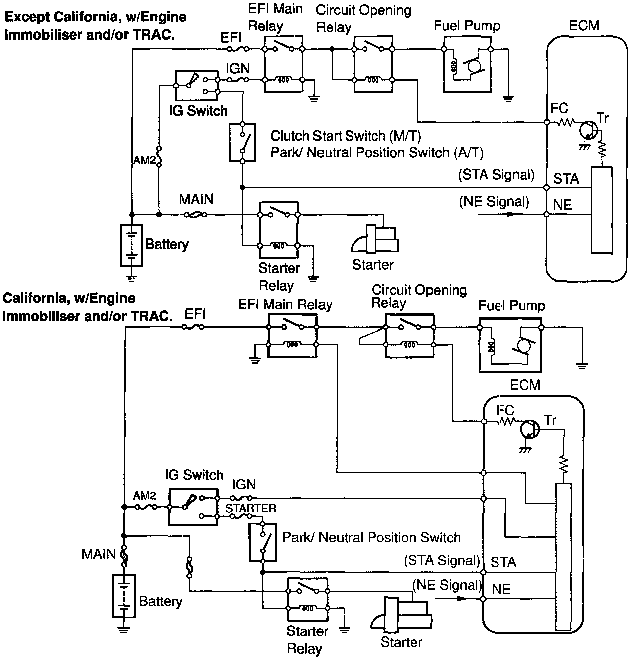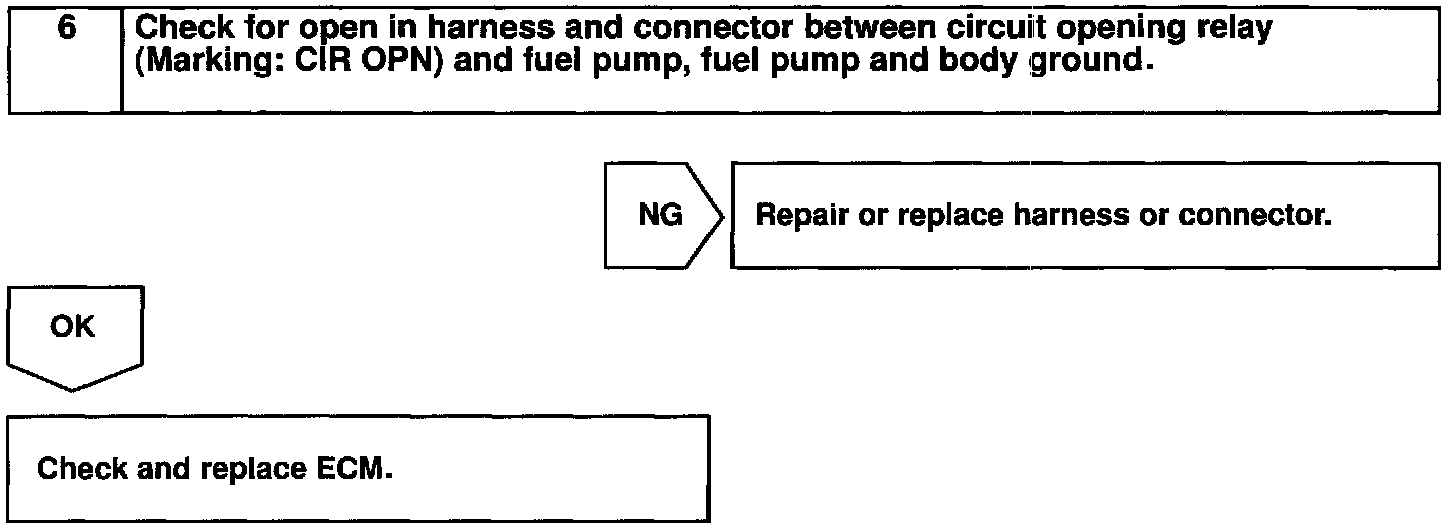When the STA signal and NE signal are input to the ECM, Tr is turned ON, current flows to coil of the circuit opening relay, the relay switches on, power is supplied to the fuel pump and the fuel pump operates. While the NE signal is generated (engine running), the ECM keeps Tr ON (circuit opening relay ON) and the fuel pump also keeps operating.
