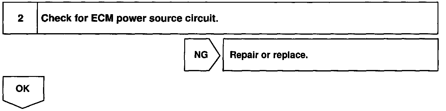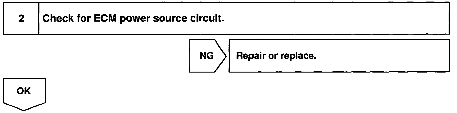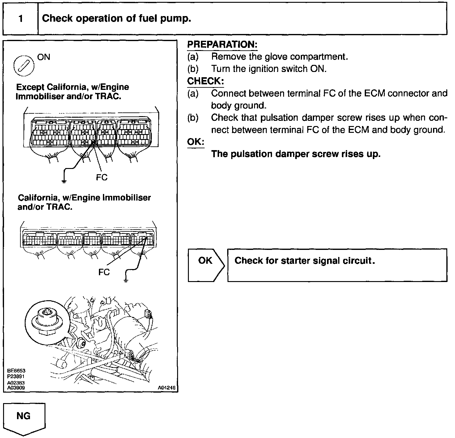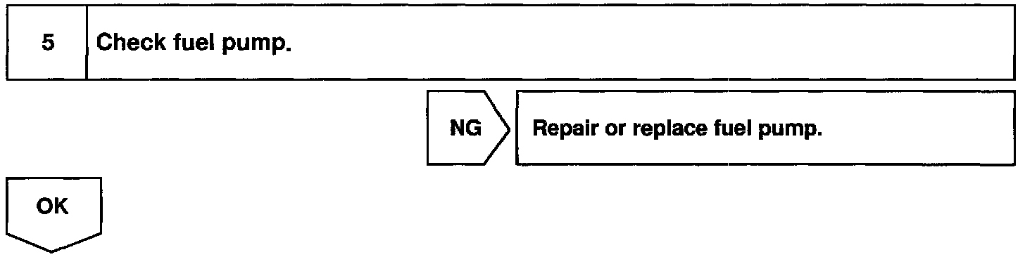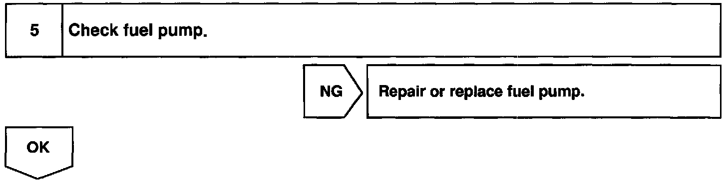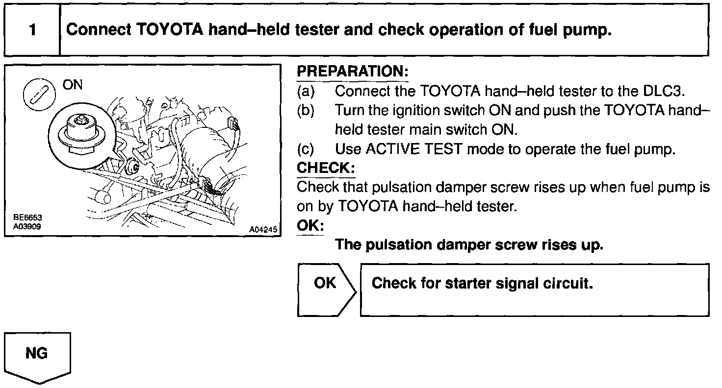 When the STA signal and NE signal are input to the ECM, Tr is turned ON, current flows to coil of the circuit opening relay, the relay switches on, power is supplied to the fuel pump and the fuel pump operates. While the NE signal is generated (engine running), the ECM keeps Tr ON (circuit opening relay ON) and the fuel pump also keeps operating.