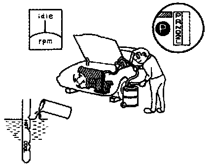 (5) With the engine idling, check the fluid level. Add fluid up to the COOL level on the dipstick.