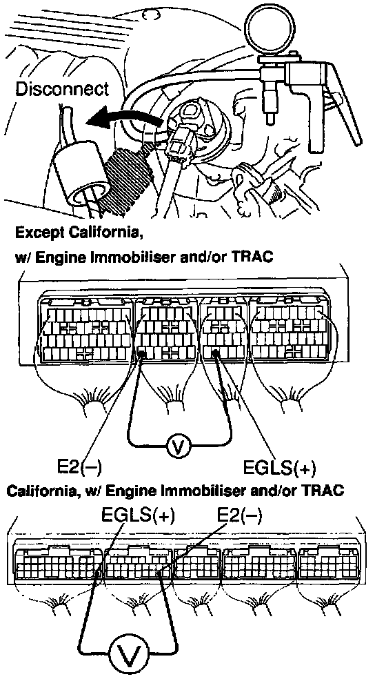 (d) Connect a voltmeter to terminals EGLS and E2 of the ECU and measure the power outlet voltage under the following conditions:
