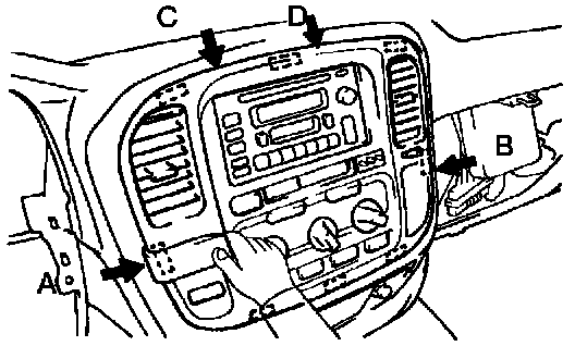 a. Using a moulding remover, remove the center cluster in order "A", "B", "C", "D", as shown in the illustration.