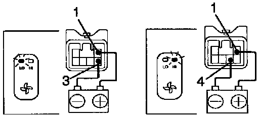 1. Connect the positive (+) lead from the battery to terminal 1 and negative (-) lead to each terminal, then check that the "LO" and "HI" indicators light up as shown in the chart.