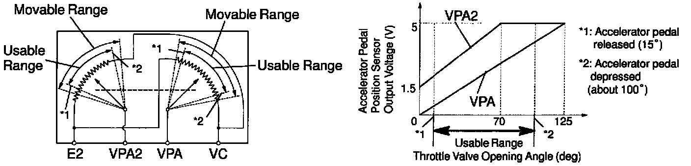 The accelerator pedal position sensor is connected with the accelerator pedal by the accelerator wire and the voltage applied to the terminals VPA and VPA2 of the ECM changes between 0 V and 5 V in proportion to the opening angle of the accelerator pedal.