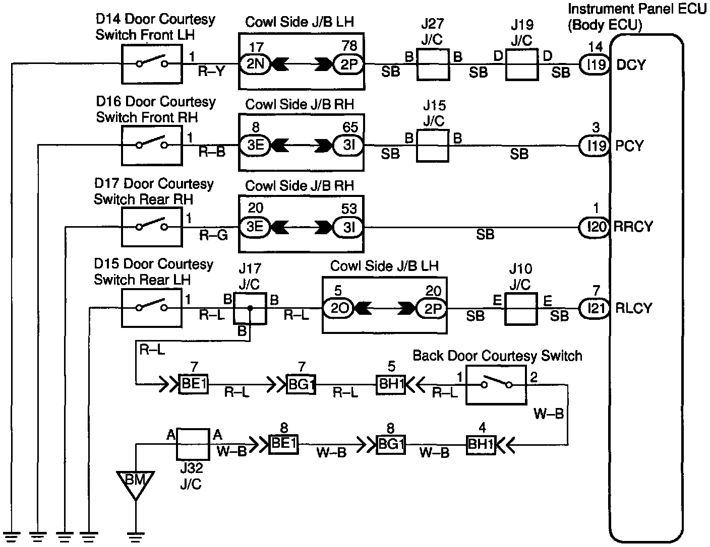 The door courtesy switch goes on when the door is opened and goes off when door is closed.