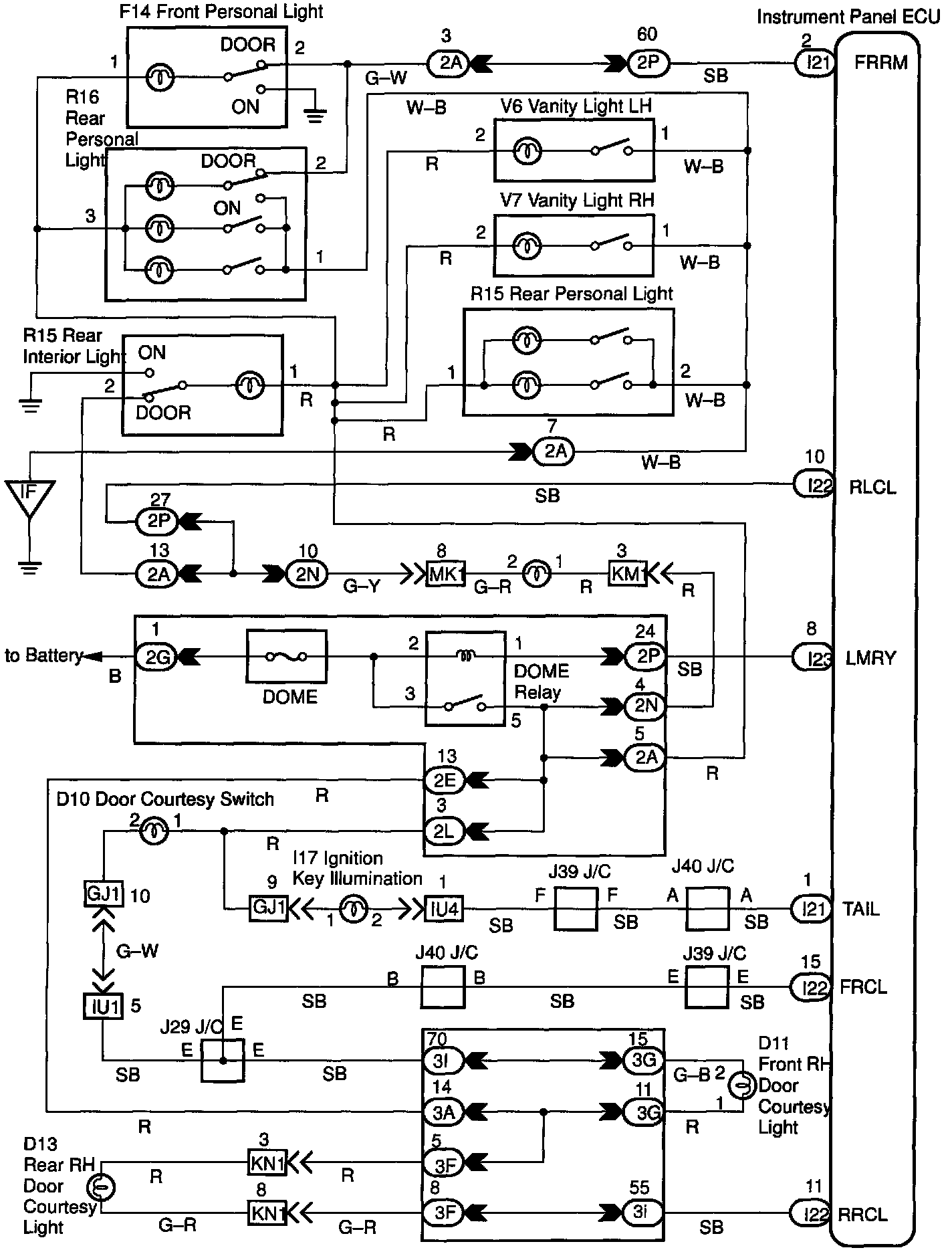 Receiving the courtesy signal from the Body ECU will make the interior light, ignition light, and courtesy light come on.
