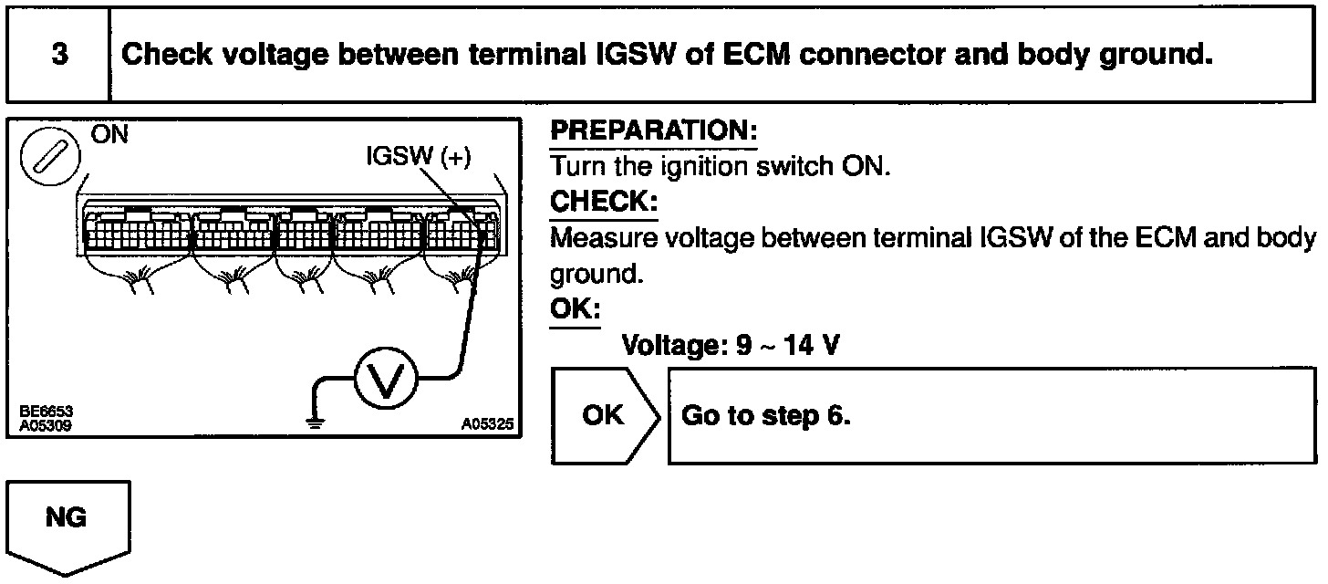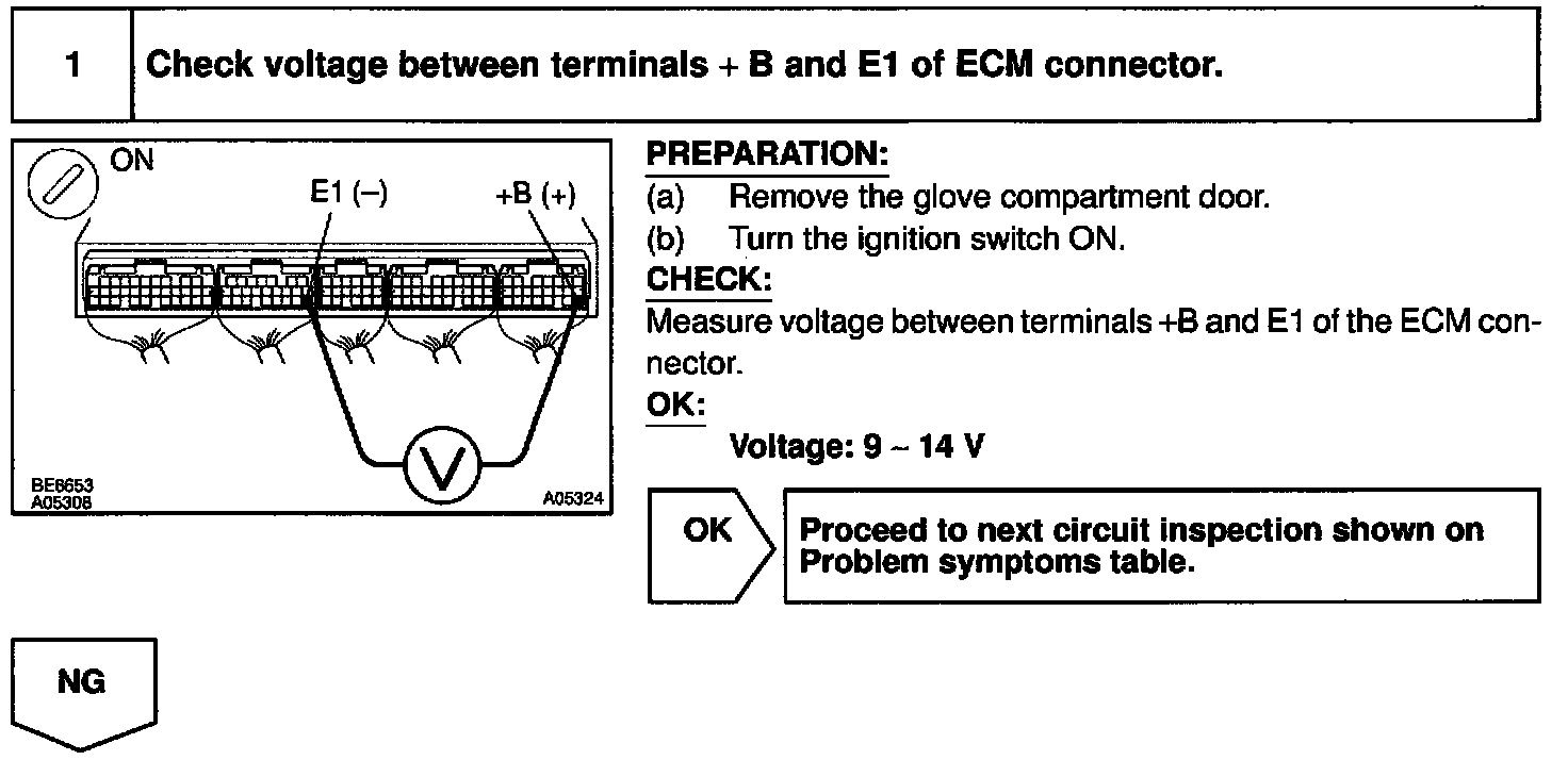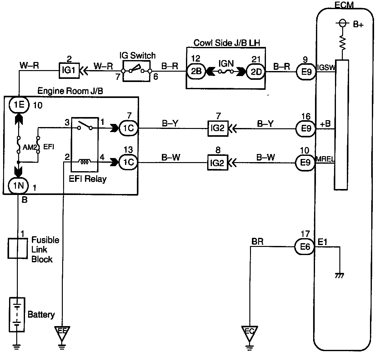 This signal causes current to flow to the coil, closing the contacts of the EFI main relay and supplying power to the terminals +B of the ECM.