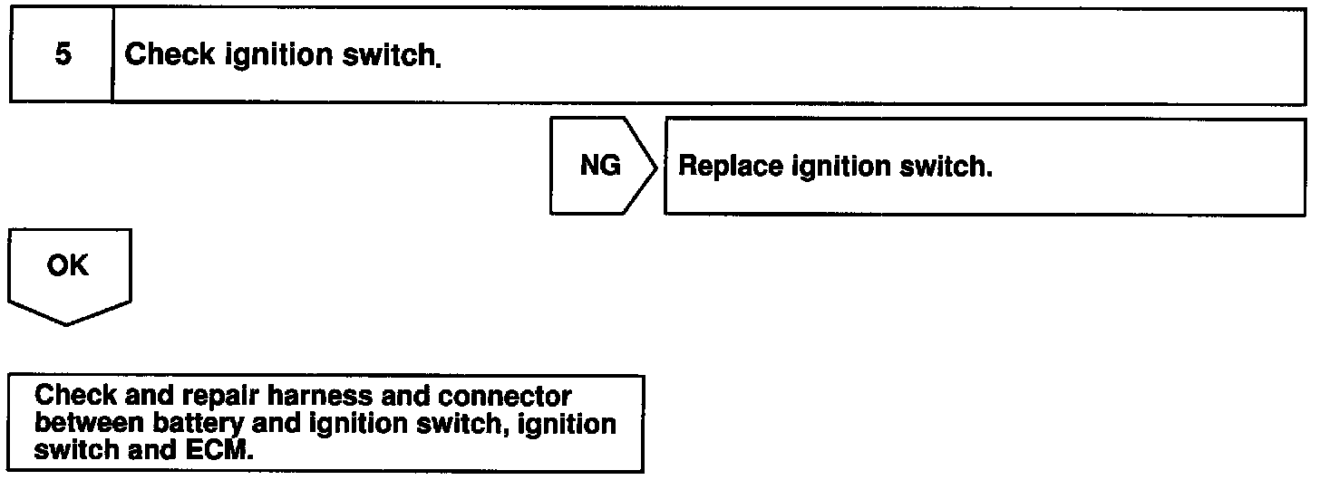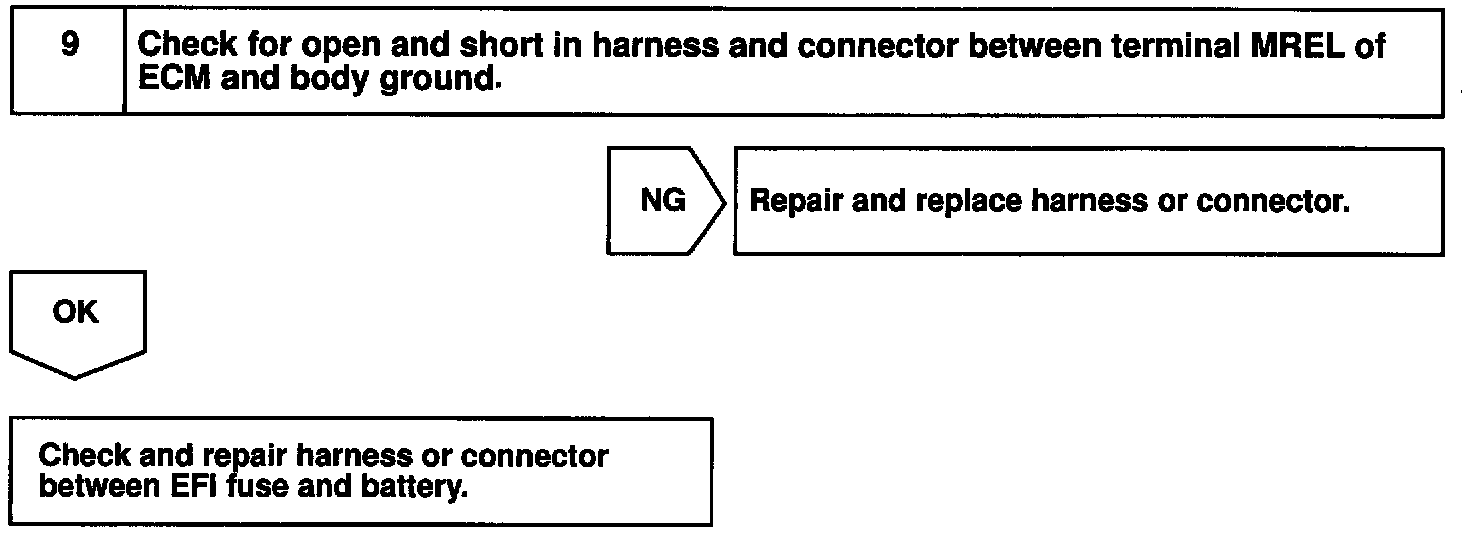When the ignition switch is turned ON, battery positive voltage is applied to the terminal IGSW of the ECM and the EFI main relay (Making: EFI) control circuit in the ECM sends a signal to the terminal MREL of the ECM switching on the EFI main relay.