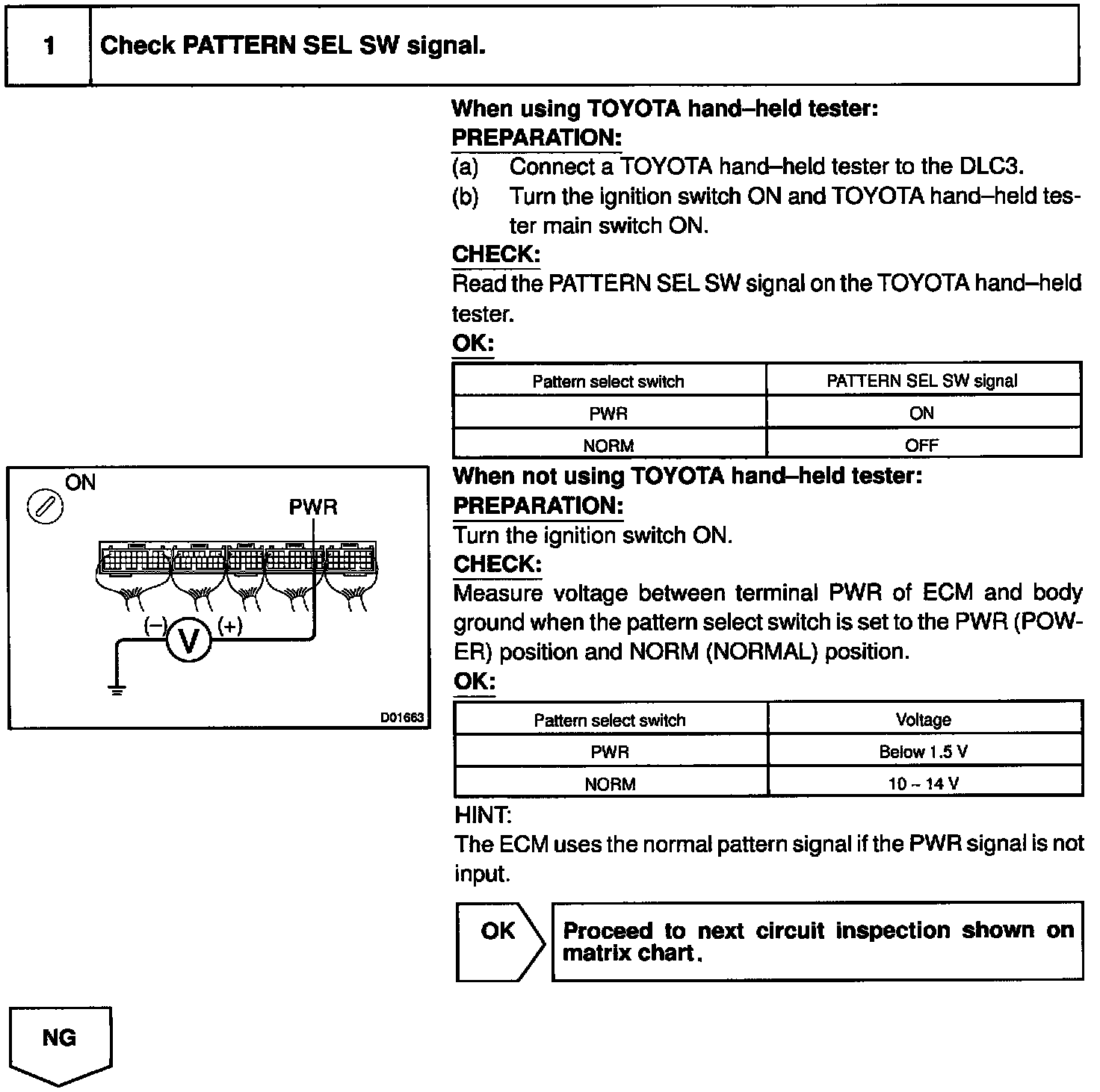 The ECM memory contains the shift programs for the NORMAL and POWER patterns, 2 position, L position and the lock-up patterns. Following the programs corresponding to the signals from the pattern select switch, the park/neutral position and other various sensors, the ECM switches the solenoid valves ON and OFF, and controls the transmission gear change and the lock-up clutch operation.